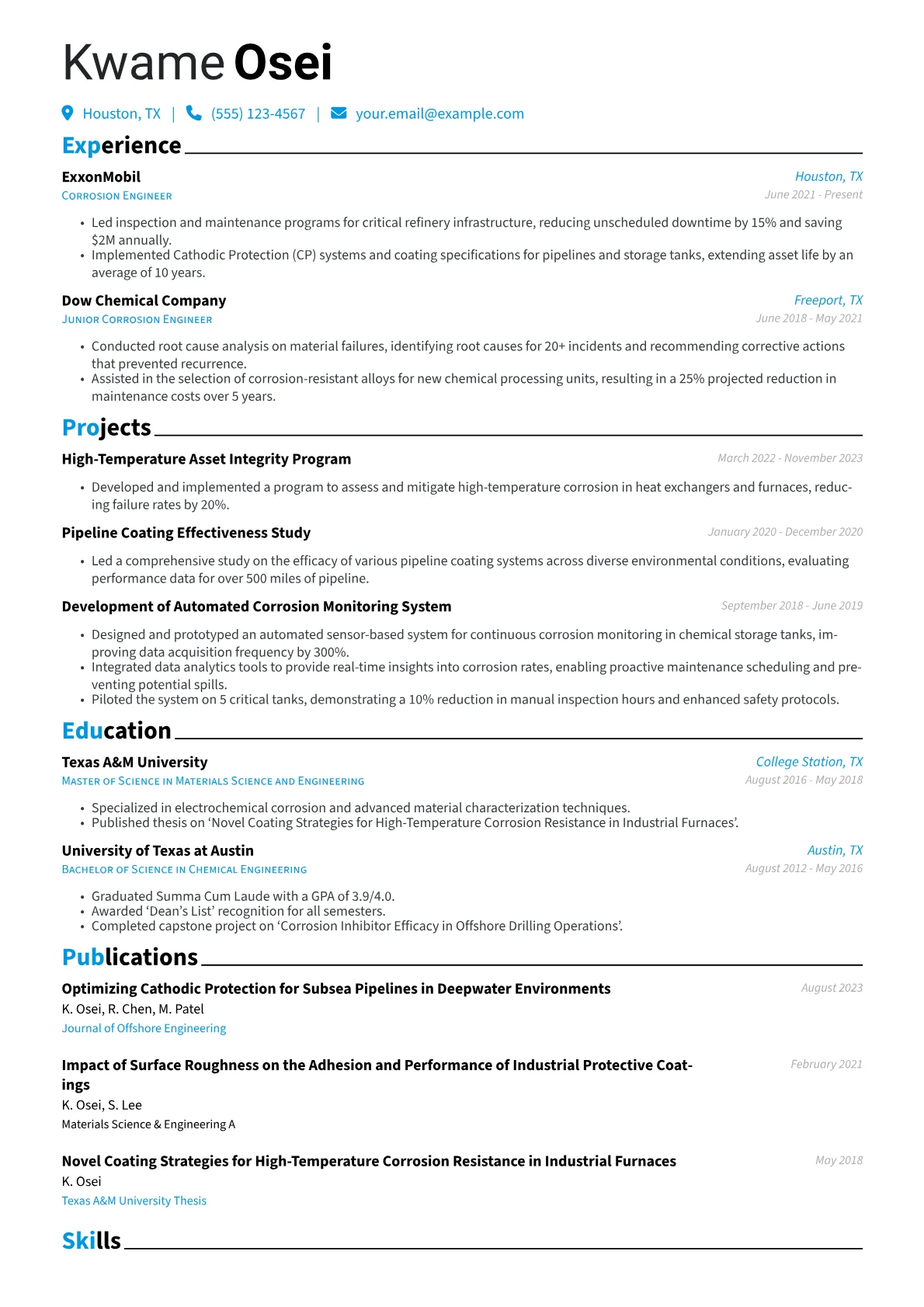 This effective template was expertly built with JobSprout and can be easily remixed to create your own compelling corrosion engineering resume, ensuring your qualifications stand out.