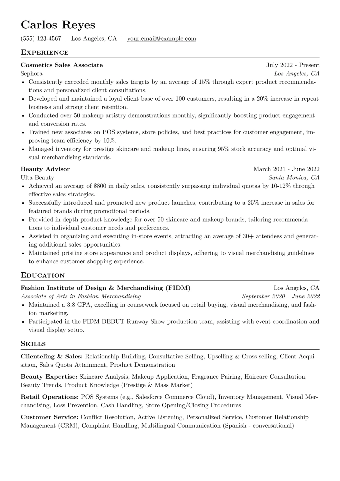 This example effectively showcases these qualities through strategically grouped skills, emphasizing both product knowledge and client engagement. It skillfully uses quantified achievements, even in entry-level roles, to demonstrate impact on sales and customer satisfaction, alongside relevant certifications that prove commitment to the beauty industry. The clear layout makes key qualifications easy for recruiters to identify.