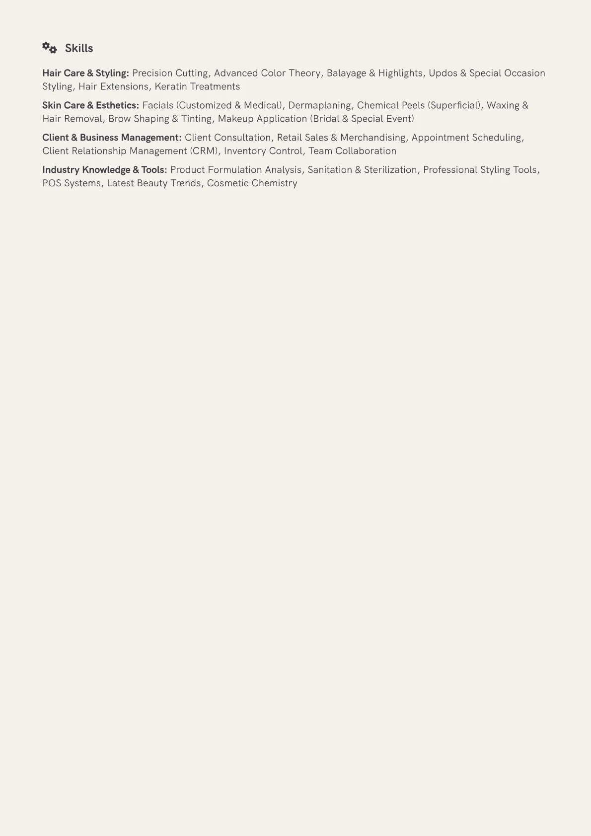 This example CV effectively highlights these crucial elements. Achievements are quantified, showing growth in client base and consistent sales performance. Skills are thoughtfully grouped, separating technical abilities like various coloring methods and makeup artistry from client relations skills such as consultation and retention strategies. Essential details like the state cosmetology license and certifications in popular product lines or advanced treatments are prominently featured, offering a clear picture of the candidate's professional development and specific proficiencies.