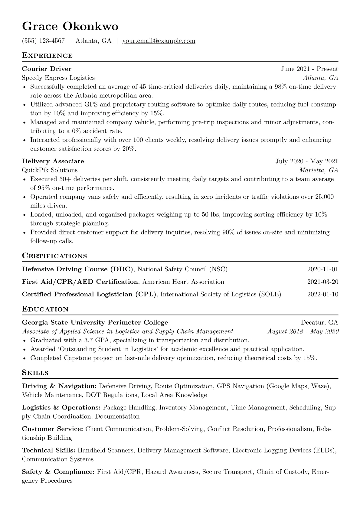 A strong entry-level Courier resume effectively highlights reliability, efficiency, and a commitment to safe delivery. Hiring managers in various industries seek candidates who demonstrate excellent navigation skills, a keen eye for detail in package handling, and strong customer service aptitude. The unique challenge for couriers is often demonstrating practical, on-the-job competencies and a proactive work ethic without extensive formal qualifications.