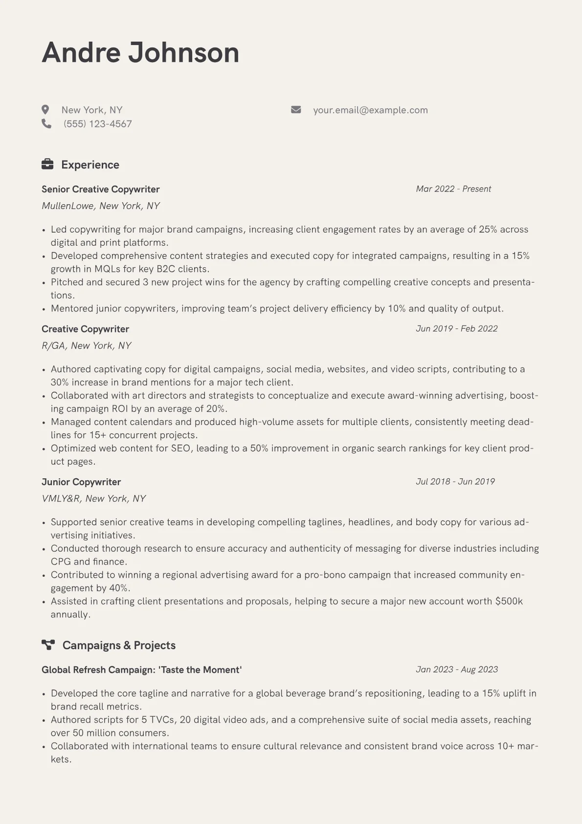 For a Creative Copywriter in Marketing and Advertising, a compelling resume showcases not just creativity, but also strategic thinking and proven results. Hiring managers seek evidence of brand voice mastery, diverse campaign experience, and the ability to drive engagement, all while demonstrating adaptability across various platforms. The unique challenge lies in making a resume itself a testament to one's persuasive writing skills and commercial impact.