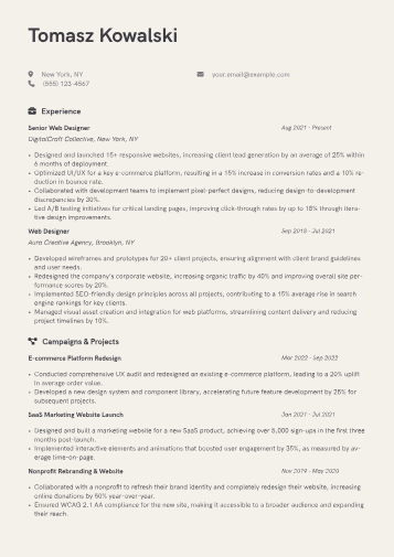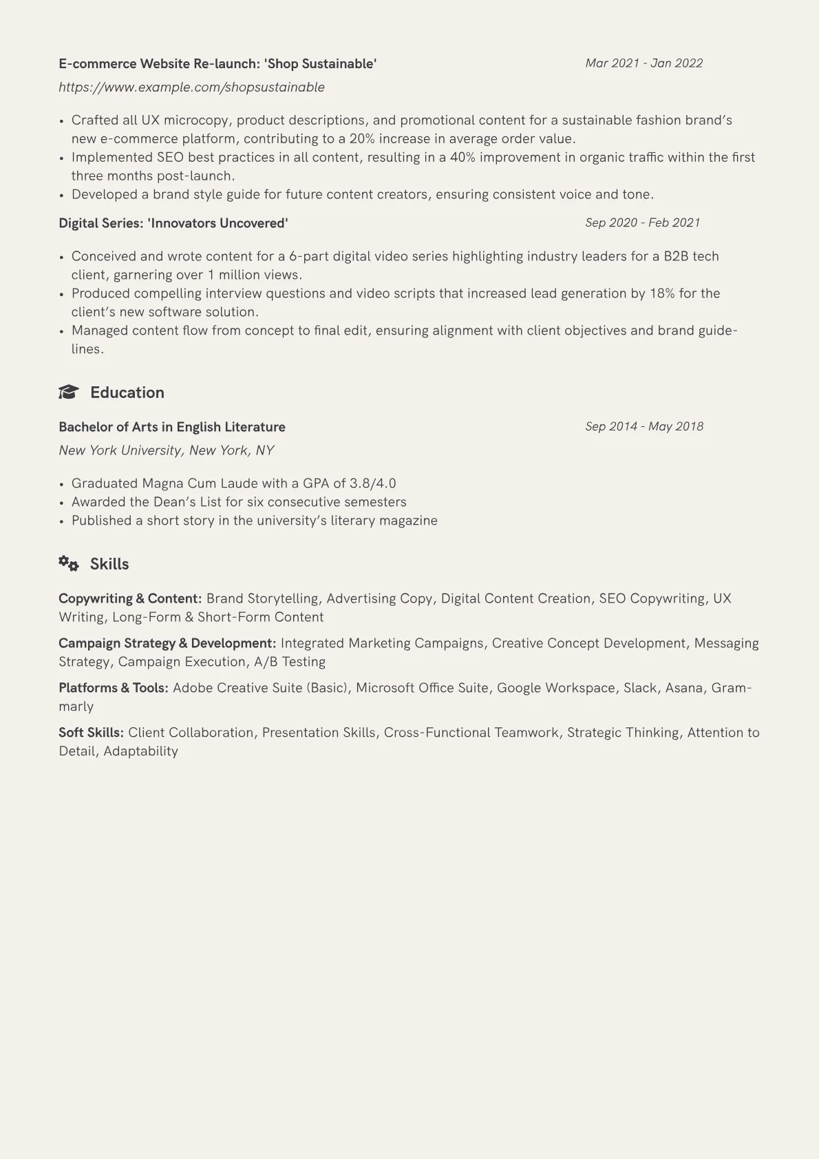 This particular example excels by featuring clearly quantified achievements, demonstrating how compelling copy translated into tangible business growth. Its well-structured skills section effectively groups proficiencies like SEO copywriting, social media content, and long-form articles, providing a quick overview of capabilities. Additionally, highlighting relevant certifications in digital marketing or content strategy further reinforces specialized expertise.
