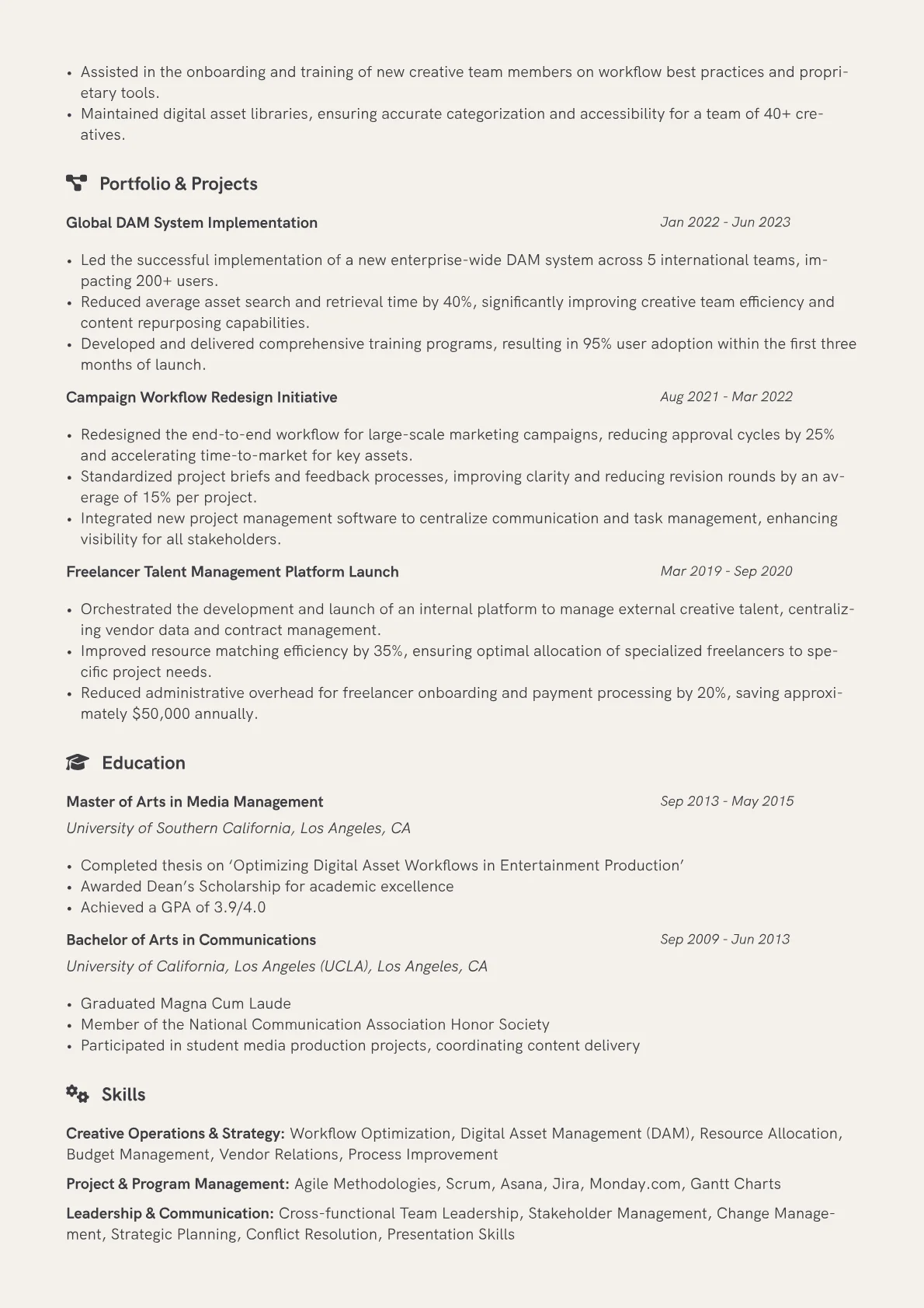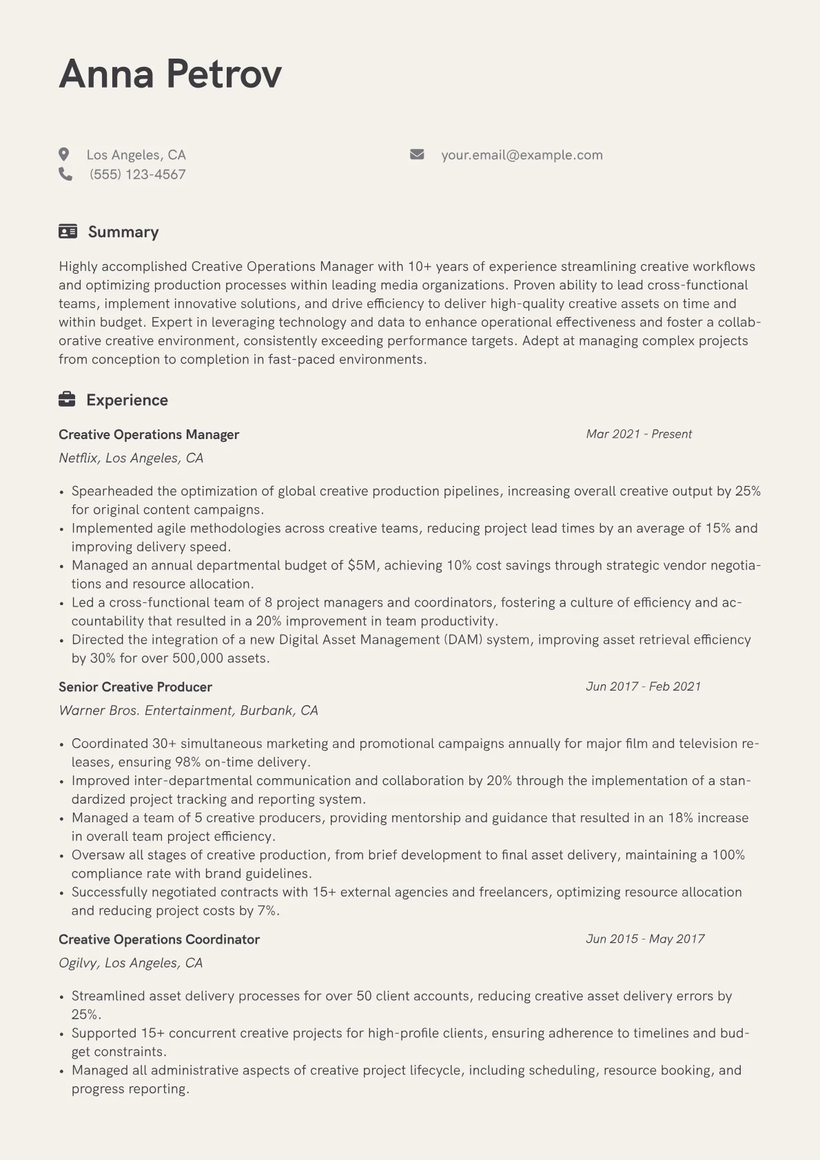This template was built with JobSprout and can be remixed to create your own tailored Creative Operations Manager resume.