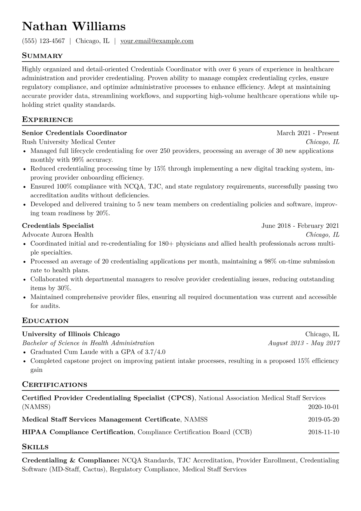 The example CV effectively showcases these critical elements. Achievements are precisely quantified, for instance, by detailing the volume of applications processed or the percentage by which compliance rates improved. Skills are thoughtfully grouped, separating technical proficiencies like specific credentialing platforms (e.g., proprietary systems, verification databases) from administrative competencies such as stakeholder communication or audit preparation. Crucially, any certifications related to compliance or data management are prominently featured, assuring employers of specialized expertise.