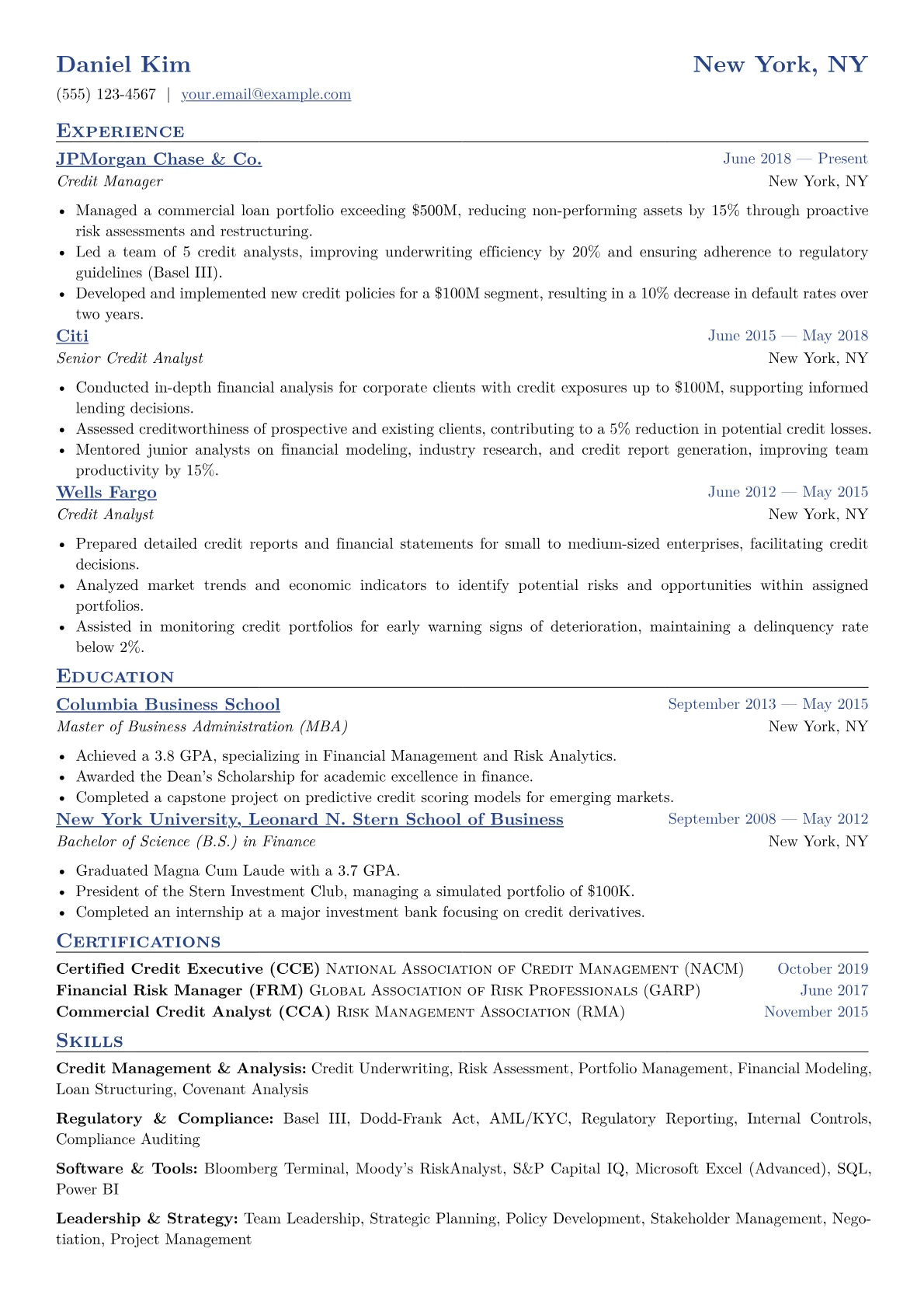A strong Credit Manager resume for senior roles in Finance & Banking must highlight a proven track record in risk mitigation, portfolio optimization, and regulatory adherence. Hiring managers prioritize candidates who demonstrate exceptional analytical skills, strategic judgment in credit policy development, and a clear ability to drive profitable growth while minimizing bad debt. The unique challenge lies in showcasing a delicate balance between robust risk management and aggressive revenue generation.
