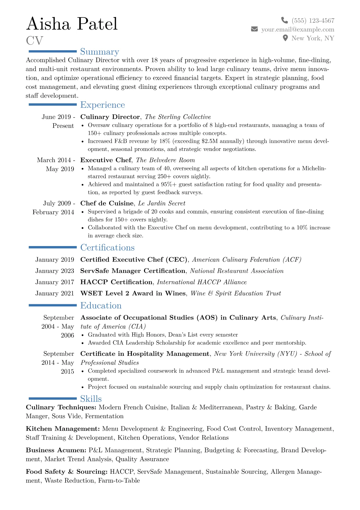 The JobSprout example CV for a Culinary Director effectively showcases these critical elements. It quantifies achievements like "reduced food waste by 18% through optimized inventory management" and "increased diner satisfaction scores by 12% across five corporate cafeterias." Skills are logically grouped into categories such as "Strategic Menu Development," "Operational Oversight," and "Team Leadership & Training," making the candidate's diverse capabilities immediately apparent. Crucially, the resume clearly highlights relevant certifications, such as a ServSafe Manager certification and proficiency in sophisticated culinary management software, demonstrating readiness for executive-level responsibilities.