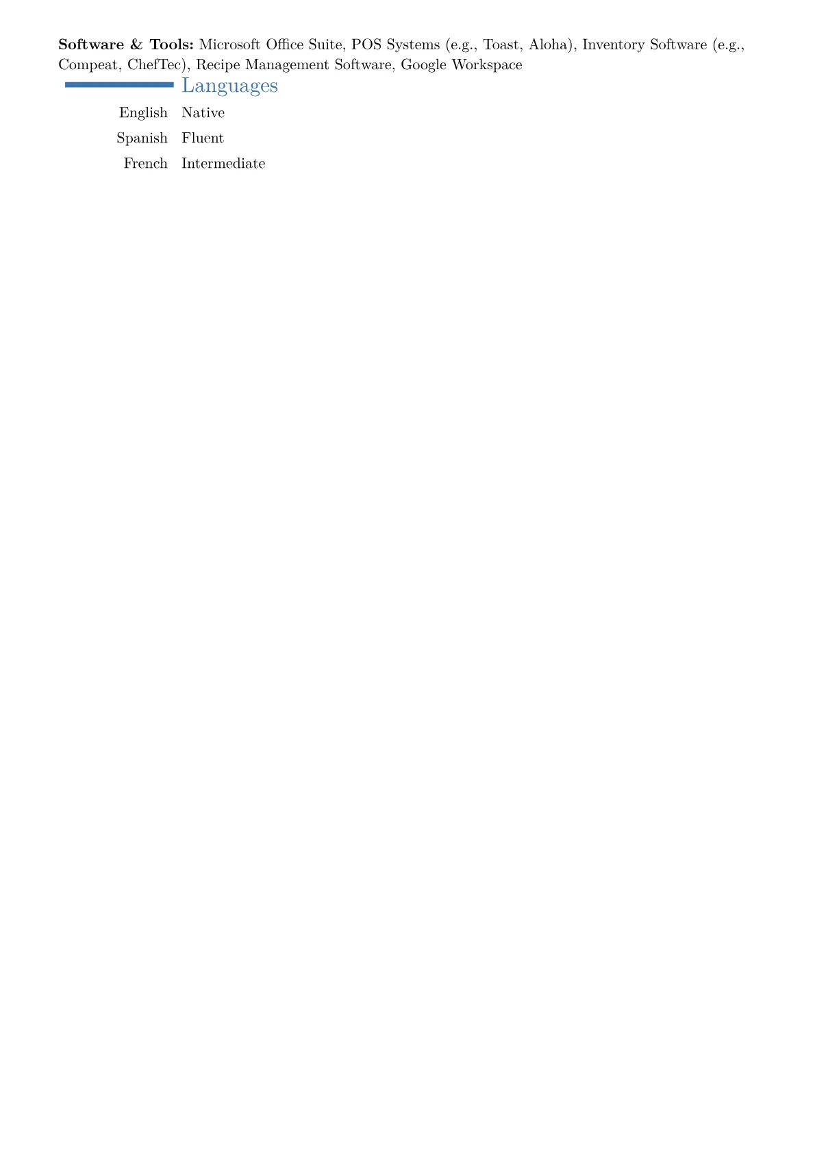 A compelling Culinary Director resume in an "Other" industry context, such as corporate hospitality or large-scale institutional dining, prioritizes strategic leadership and operational acumen over solely culinary flair. Hiring managers look for demonstrated success in P&L management, vendor negotiation, and implementing large-scale menu development initiatives that align with corporate objectives. Achievements should highlight cost savings, improved efficiency, and enhanced guest satisfaction scores, often tied to multi-unit operations or complex dietary requirements. Expertise in HACCP compliance, advanced food safety protocols, and certifications like Certified Executive Chef (CEC) or specific culinary arts degrees are highly valued.