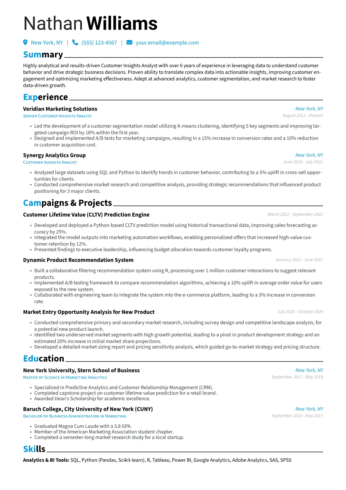 This robust template was built with JobSprout. It can be easily remixed to create your own tailored Customer Insights Analyst resume, ensuring your unique expertise shines.