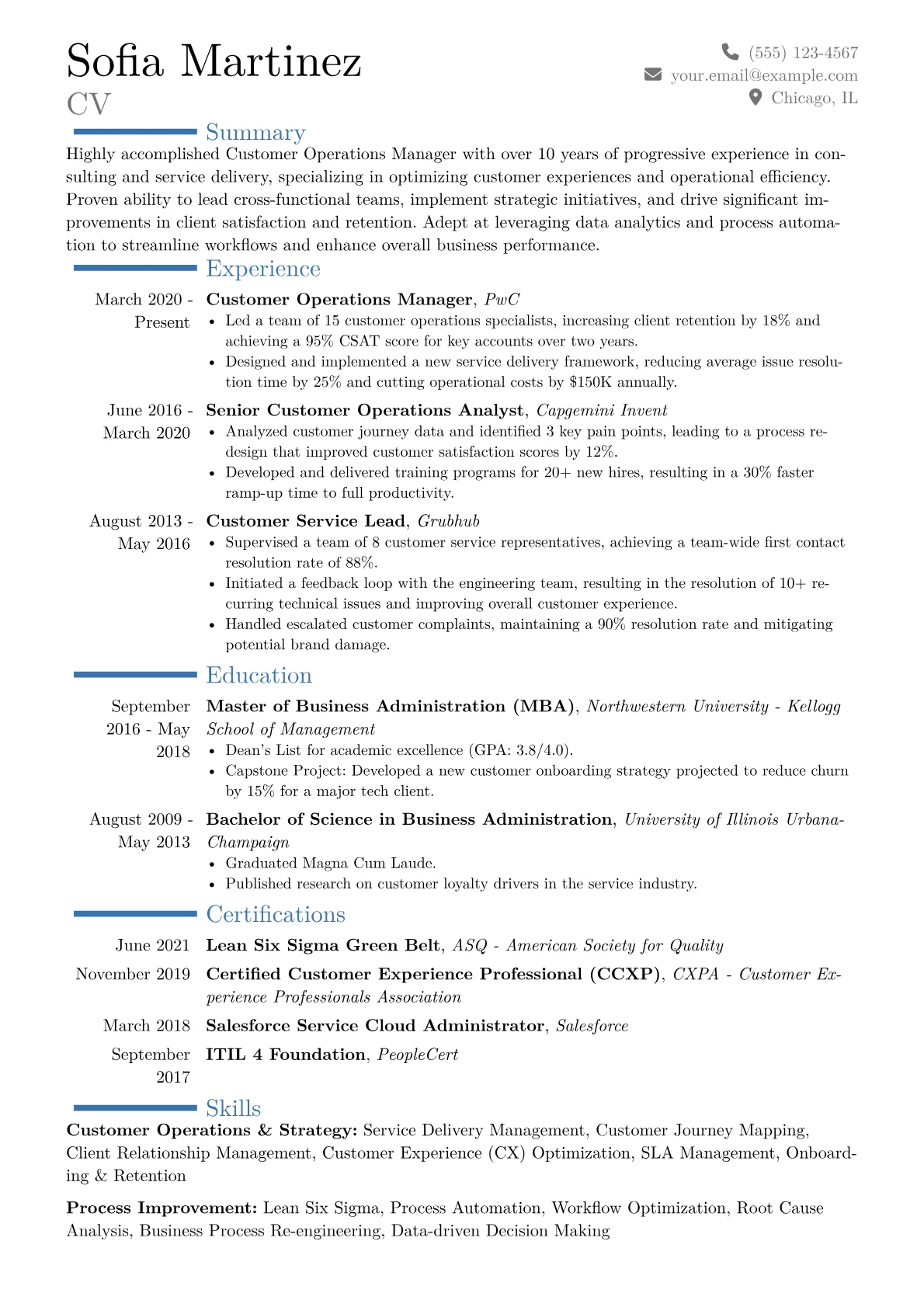 This example CV excels at capturing these critical elements. It thoughtfully groups skills into relevant categories like "Client Solutions" and "Process Automation," immediately signaling a strategic focus. Achievements are consistently quantified, providing clear metrics such as "Reduced client's support costs by 18% through AI chatbot integration" or "Improved customer onboarding speed by 25% across multiple engagements." Additionally, specific tools and certifications relevant to a Customer Operations Manager, like Salesforce, ServiceNow, and Lean methodologies, are prominently highlighted, showcasing specialized capability.