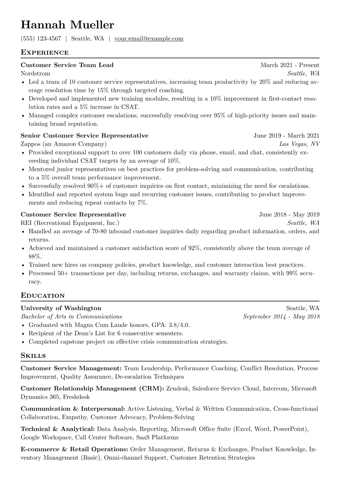This example excels by utilizing quantified achievements throughout the experience section, illustrating direct contributions to key metrics like reduced resolution times or increased CSAT scores. The strategic grouping of both technical and soft skills, such as CRM proficiency and conflict resolution, immediately signals readiness for the demands of the role. Highlighting relevant certifications further strengthens credibility and showcases a commitment to professional development.