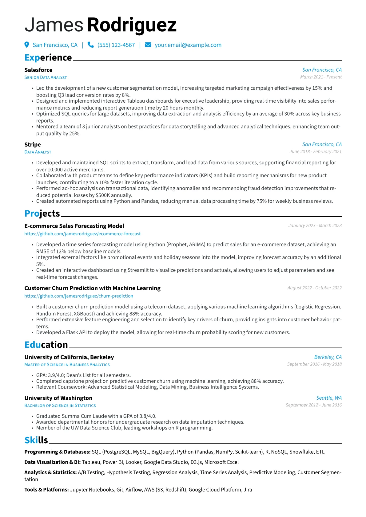 This exemplary Data Analyst resume was crafted using JobSprout's powerful builder. Professionals can leverage this template as a starting point to effectively showcase their own expertise and create a compelling application.
