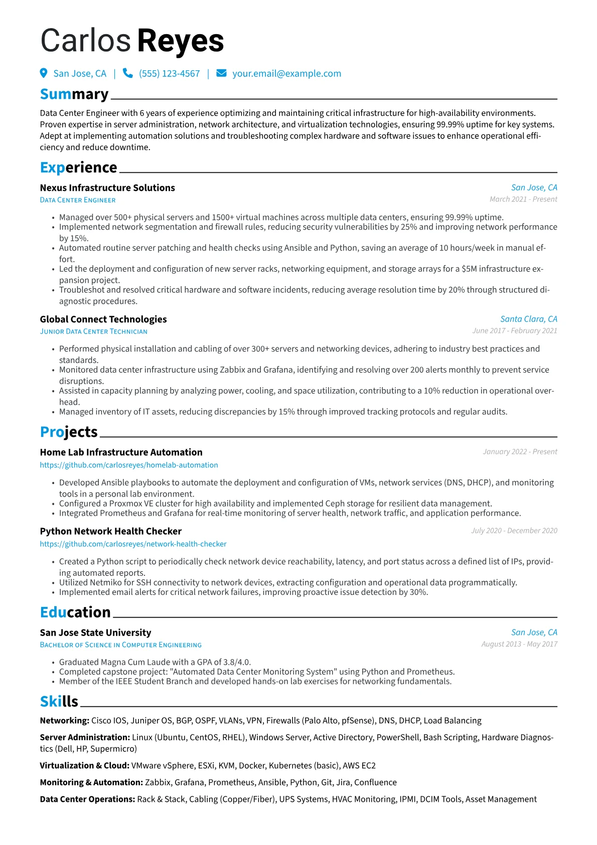 The JobSprout example skillfully illustrates these expectations. Achievements are effectively quantified, detailing impact on reliability or efficiency rather than just listing responsibilities. Skills are strategically grouped into categories such as "Networking & Connectivity," "Cloud & Virtualization," and "Automation & Scripting," providing immediate clarity. Critical certifications and proficiency with tools like Terraform or Prometheus are prominently highlighted, quickly communicating core competencies relevant to a mid-level Data Center Engineer.