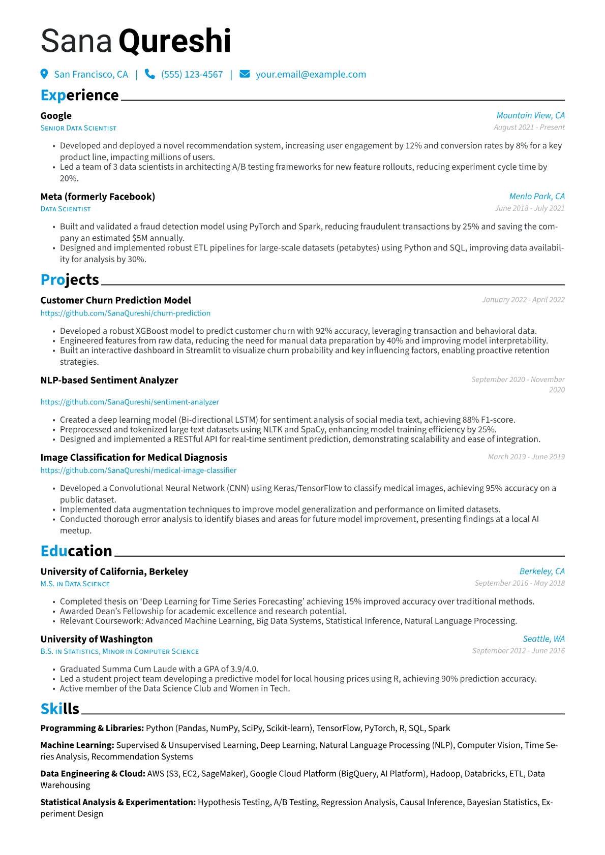 This particular Data Scientist example excels at highlighting these crucial elements. It effectively groups technical skills, making it easy for recruiters to identify expertise in areas like statistical modeling and big data technologies. Furthermore, the experience section features compelling, quantified achievements, illustrating how the candidate's work improved model performance or optimized business processes.
