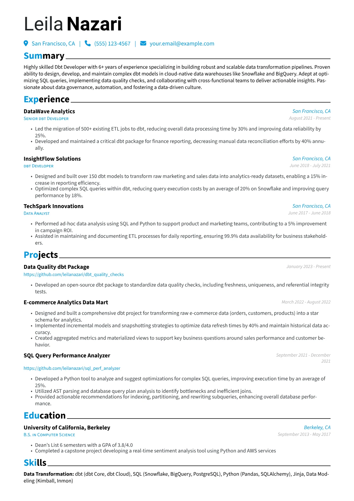 This example CV effectively structures its content to highlight essential Dbt Developer competencies. Achievements are precisely quantified, such as "optimized data models, reducing query runtimes by 30% for key analytics dashboards" or "implemented dbt packages that standardized data ingestion across five source systems." Technical skills are logically grouped under headings like 'Data Transformation Tools' featuring dbt, 'Cloud Platforms' listing AWS or GCP, and 'Programming Languages' including SQL and Python. This clear categorization quickly communicates the developer's comprehensive toolkit, alongside specific dbt certifications or project contributions that underscore deep domain knowledge.