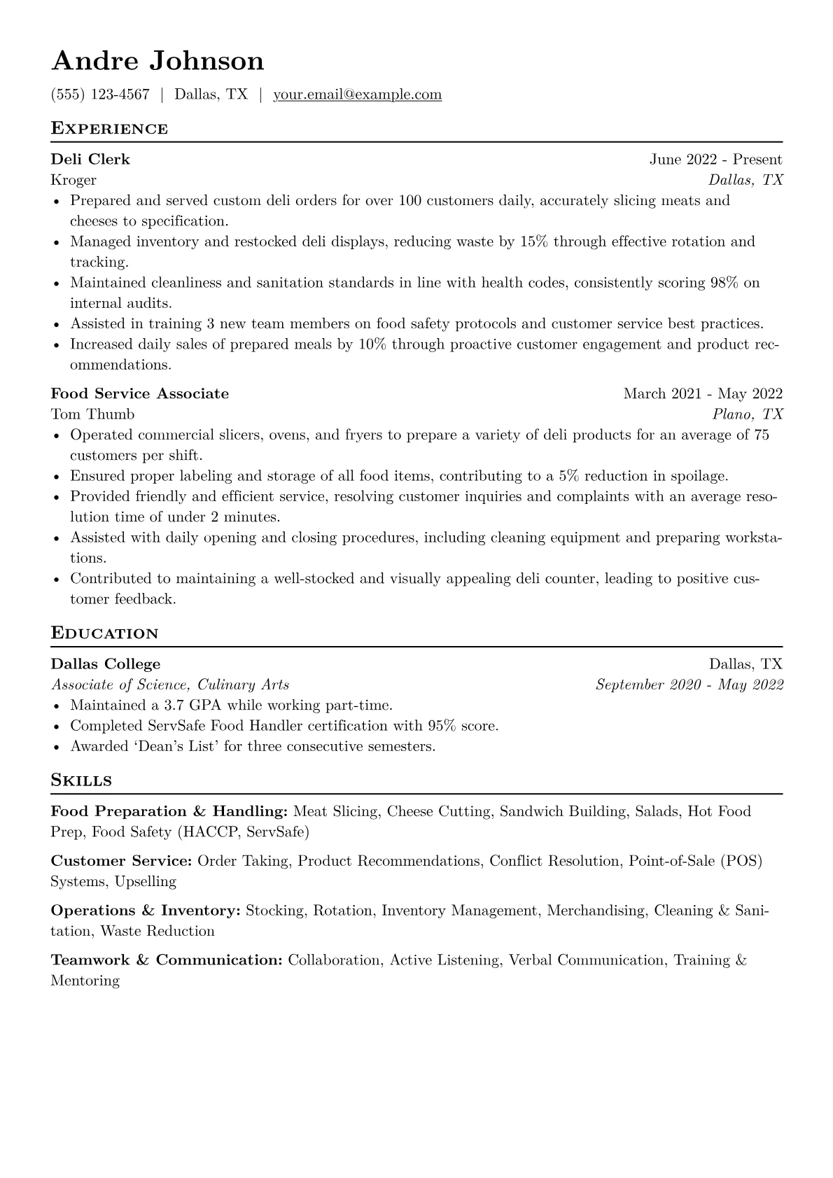 This JobSprout example excels by showcasing quantified achievements, such as serving a specific number of customers daily or reducing waste percentages, which provides concrete evidence of capability. Its clear skill grouping effectively highlights competencies like food preparation, inventory management, and cash handling, along with relevant certifications crucial for the industry.