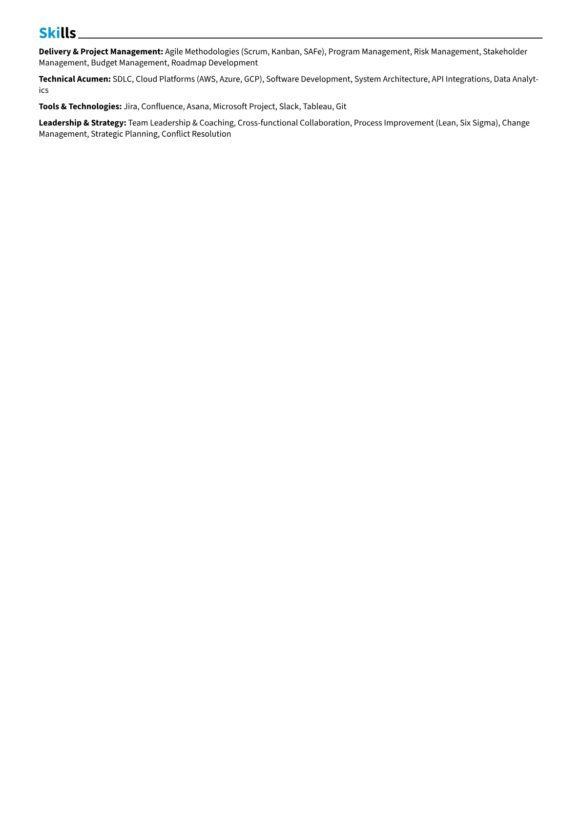 A compelling Delivery Manager resume in the technology sector showcases a candidate's proven ability to orchestrate complex software development and release cycles. Hiring managers specifically seek quantifiable achievements related to project velocity, budget management, and the successful deployment of critical software products. Nuances include proficiency with Agile methodologies like Scrum or SAFe, experience managing cross-functional engineering teams, and familiarity with CI/CD pipelines and DevOps practices. High-value terminology includes 'stakeholder alignment,' 'technical debt reduction,' and certifications such as Certified ScrumMaster (CSM) or SAFe Agilist.