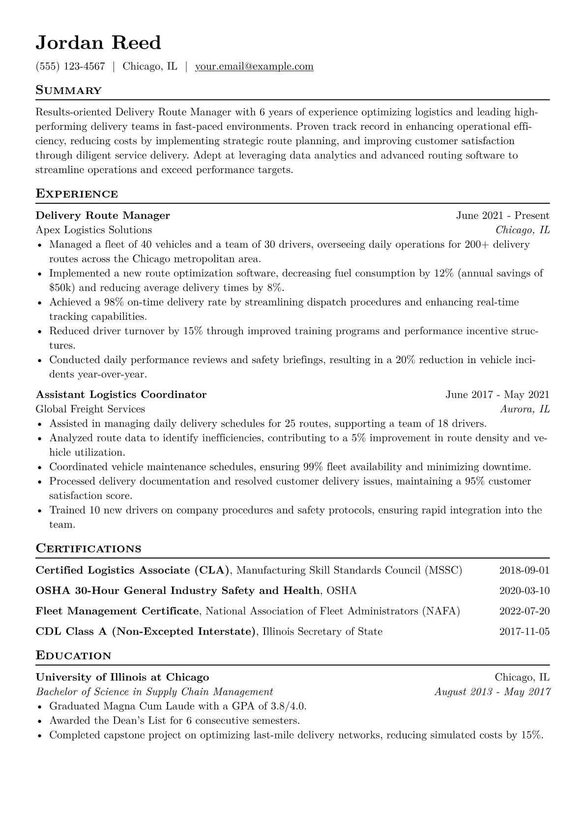 This template was built with JobSprout and can be remixed to create your own tailored Delivery Route Manager resume.