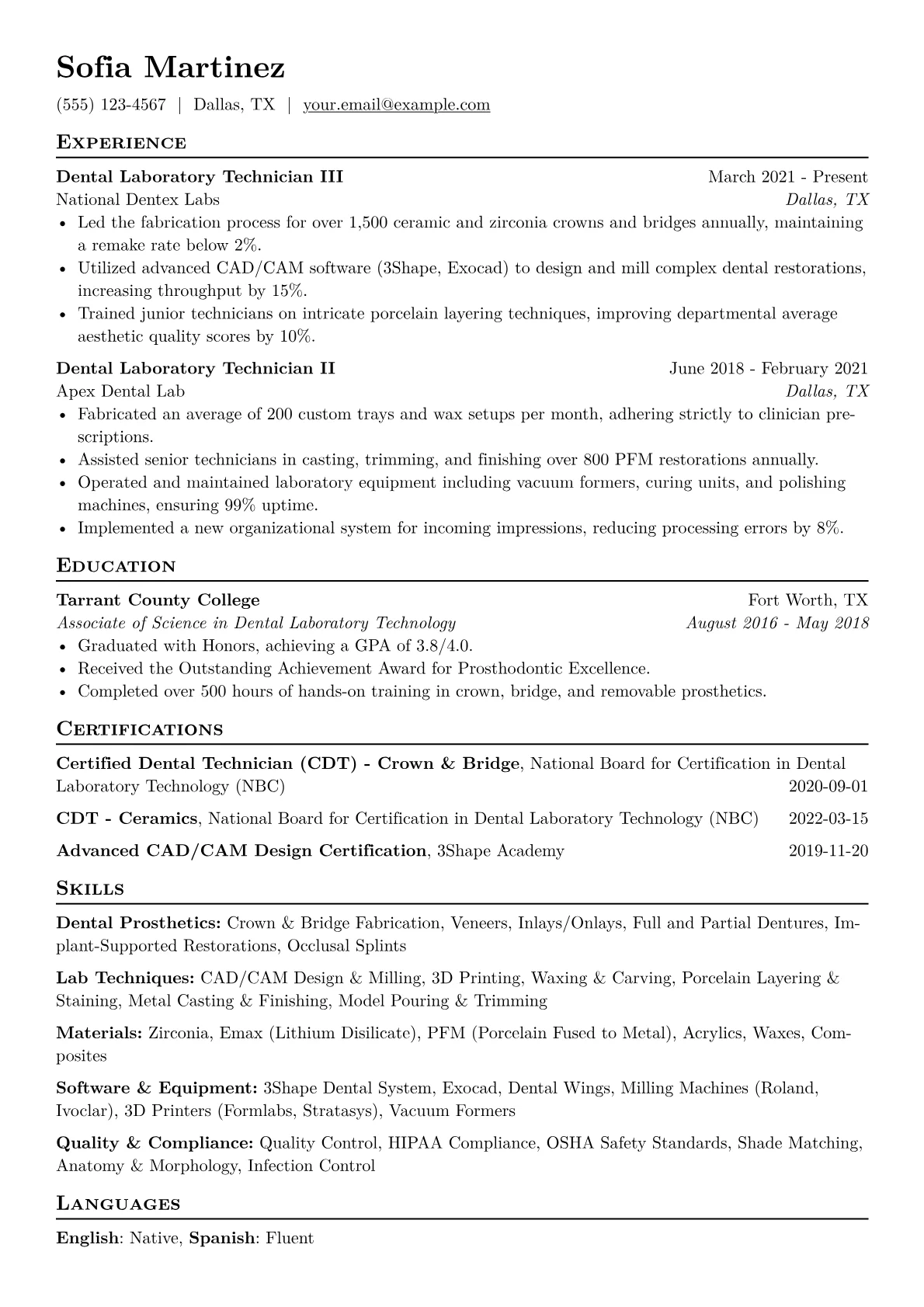 This example excels by strategically grouping specialized skills like CAD/CAM software proficiency, crown and bridge fabrication, and implant abutment design, making expertise immediately clear. Quantified achievements, such as "fabricated an average of X units per day" or "reduced remake rates by Y percent," demonstrate tangible impact and efficiency. The inclusion of specific certifications like CDT reinforces professional credibility and commitment to the field.