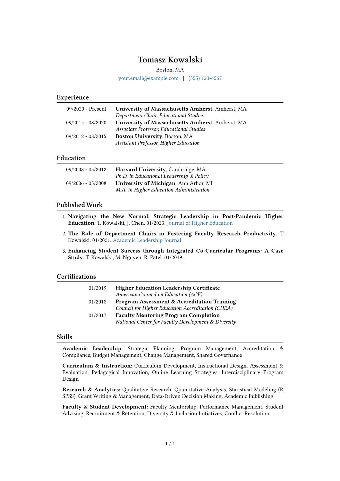 This JobSprout example masterfully demonstrates these qualities by prominently featuring quantified achievements, such as a percentage increase in department research output or successful grant awards. Its logical skills grouping clearly distinguishes between leadership, research, and administrative competencies, providing a holistic view of the candidate's capabilities. Additionally, the inclusion of relevant certifications and professional affiliations underscores specialized expertise within the academic landscape.