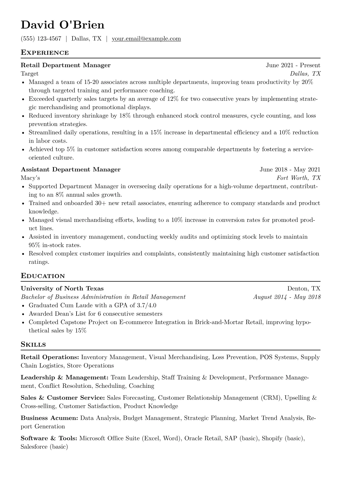 This robust template was built with JobSprout and can be easily remixed to create your own standout Retail Department Manager resume.