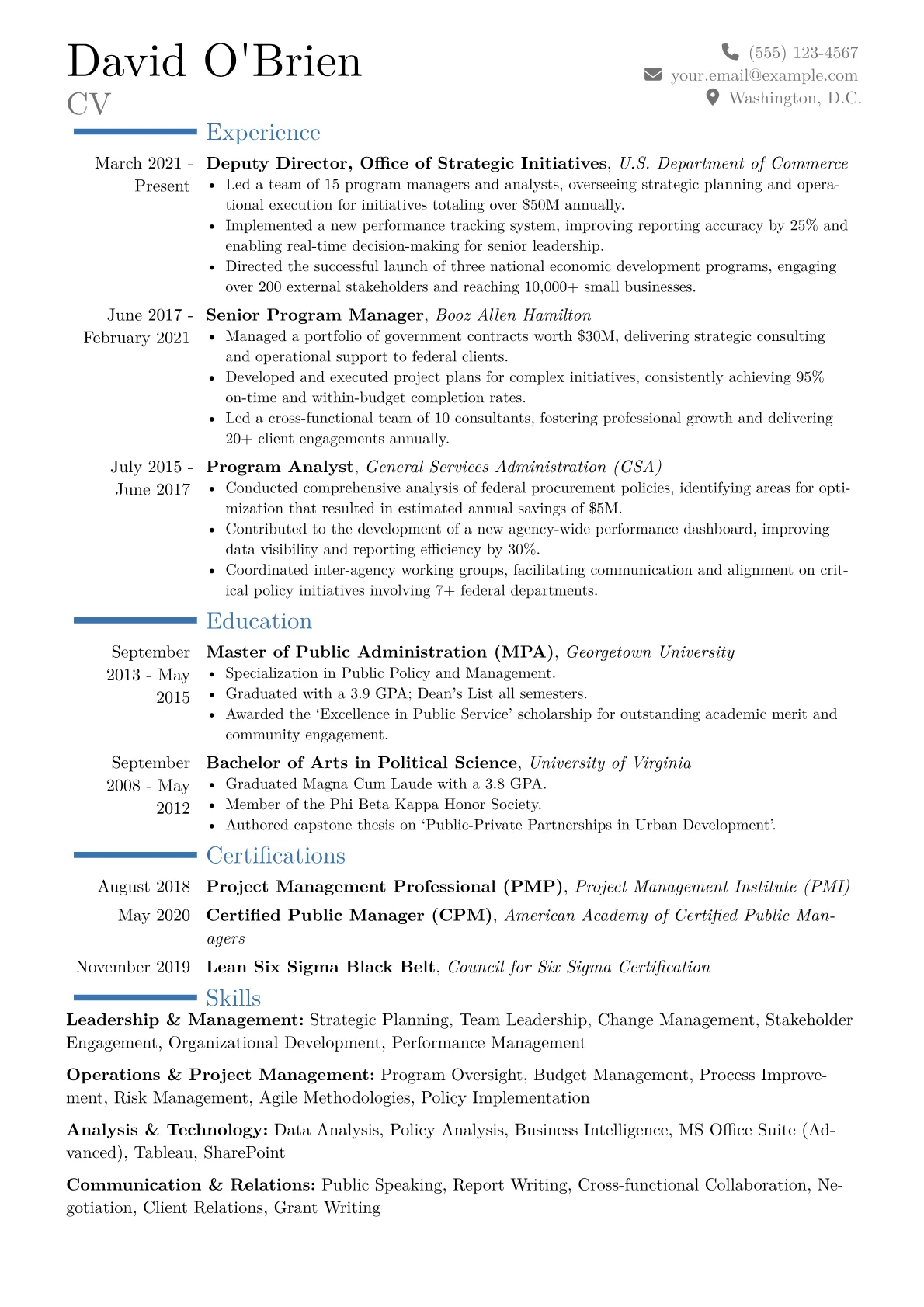 This Deputy Director example excels by immediately highlighting quantified achievements, showcasing concrete improvements in efficiency, budget management, and team performance. Its effective skills grouping prominently features core competencies like process optimization and stakeholder engagement, providing a clear snapshot of expertise. The inclusion of relevant certifications further bolsters credibility, underscoring specialized knowledge crucial for senior operational roles.