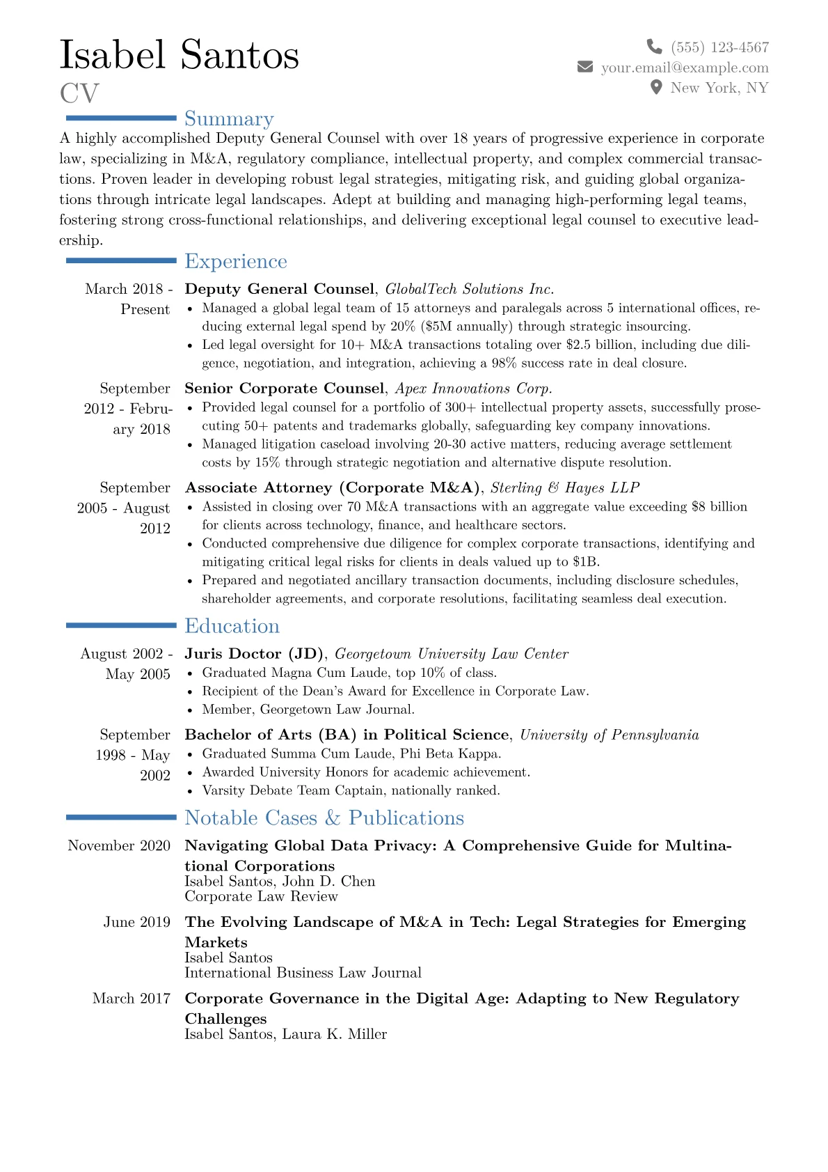 This example CV excels by structuring experience to highlight direct impact, not just responsibilities. Achievements are consistently quantified, showcasing metrics like legal spend reduction or transaction values on M&A deals. Legal skills are intuitively grouped, separating areas like "Regulatory Compliance & Risk Management" from "Commercial Transactions & IP Strategy," making expertise immediately discernible. Furthermore, specific bar admissions and relevant privacy certifications are prominently featured, underscoring critical qualifications.