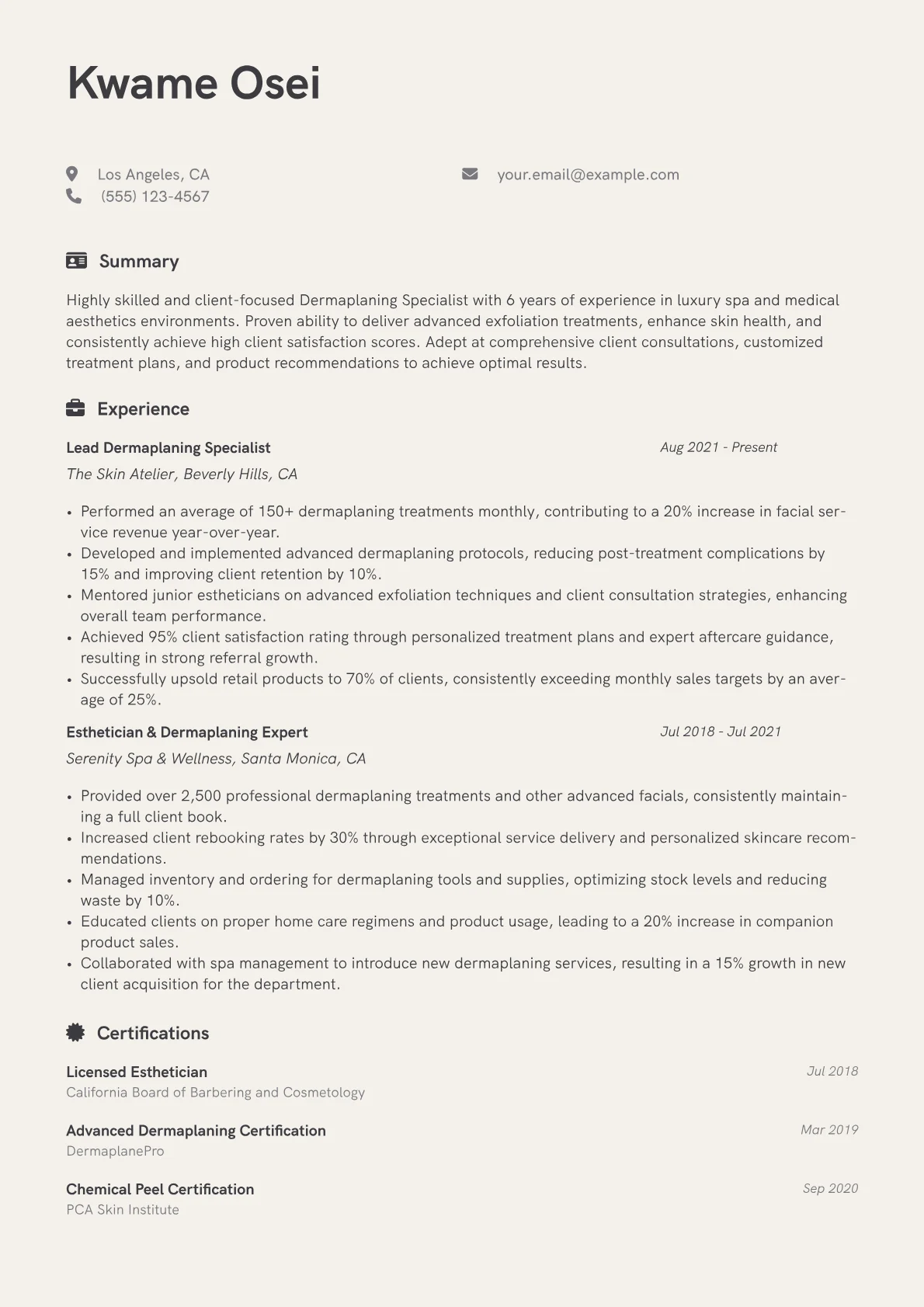 This template was built with JobSprout and can be remixed to create your own tailored Dermaplaning Specialist resume.