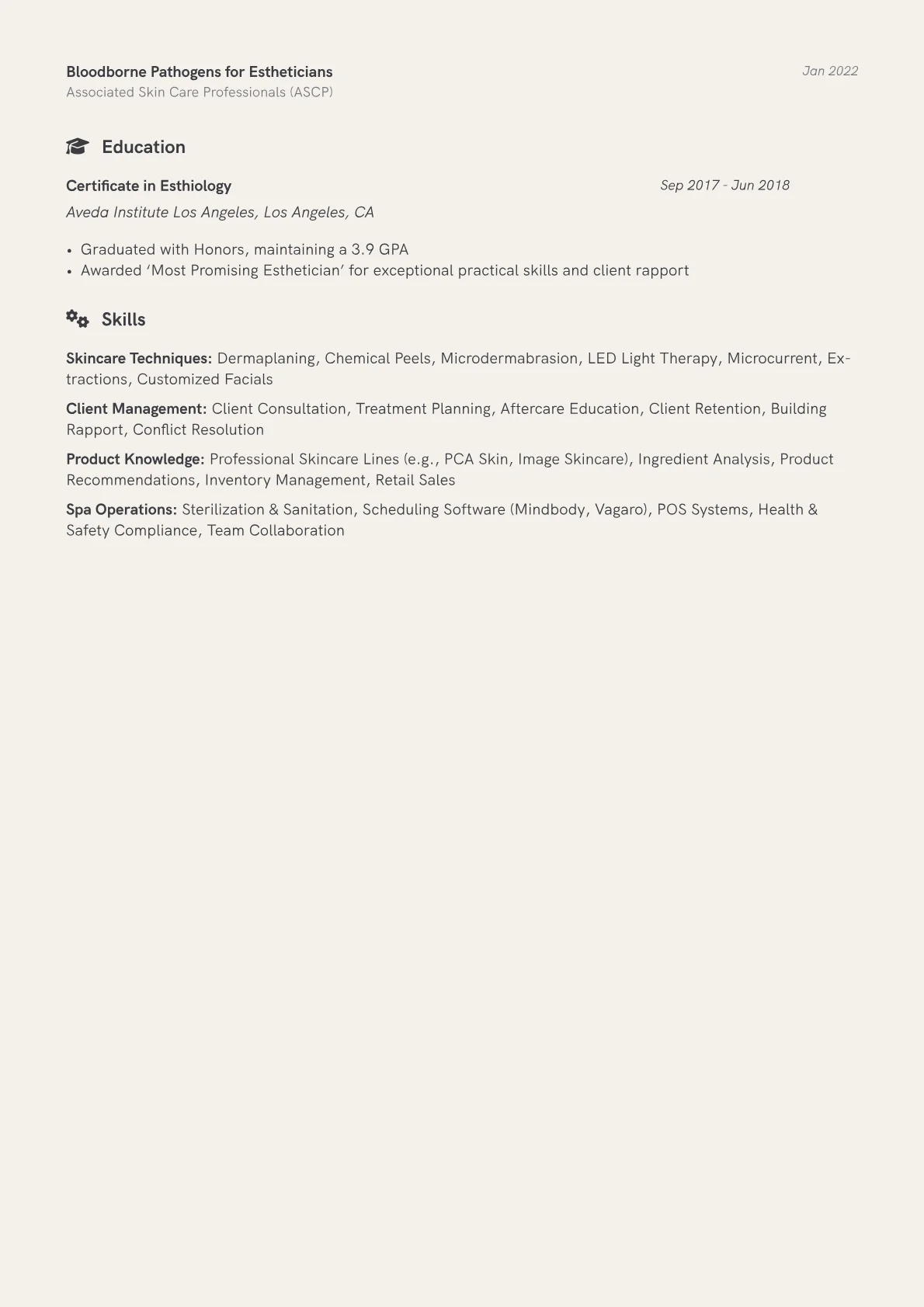 This example CV effectively structures these vital components. It quantifies achievements by stating, for instance, "increased client rebooking by 15% through personalized aftercare plans" or "successfully performed over 500 dermaplaning treatments." Skills are logically grouped, distinguishing "Technical Proficiencies" (e.g., sterile scalpel handling, medical-grade product application) from "Client Engagement" (e.g., pre-treatment consultation, skin analysis). Crucial certifications, such as advanced aesthetician licensure or specific product line training, are prominently featured, assuring employers of compliance and expertise.