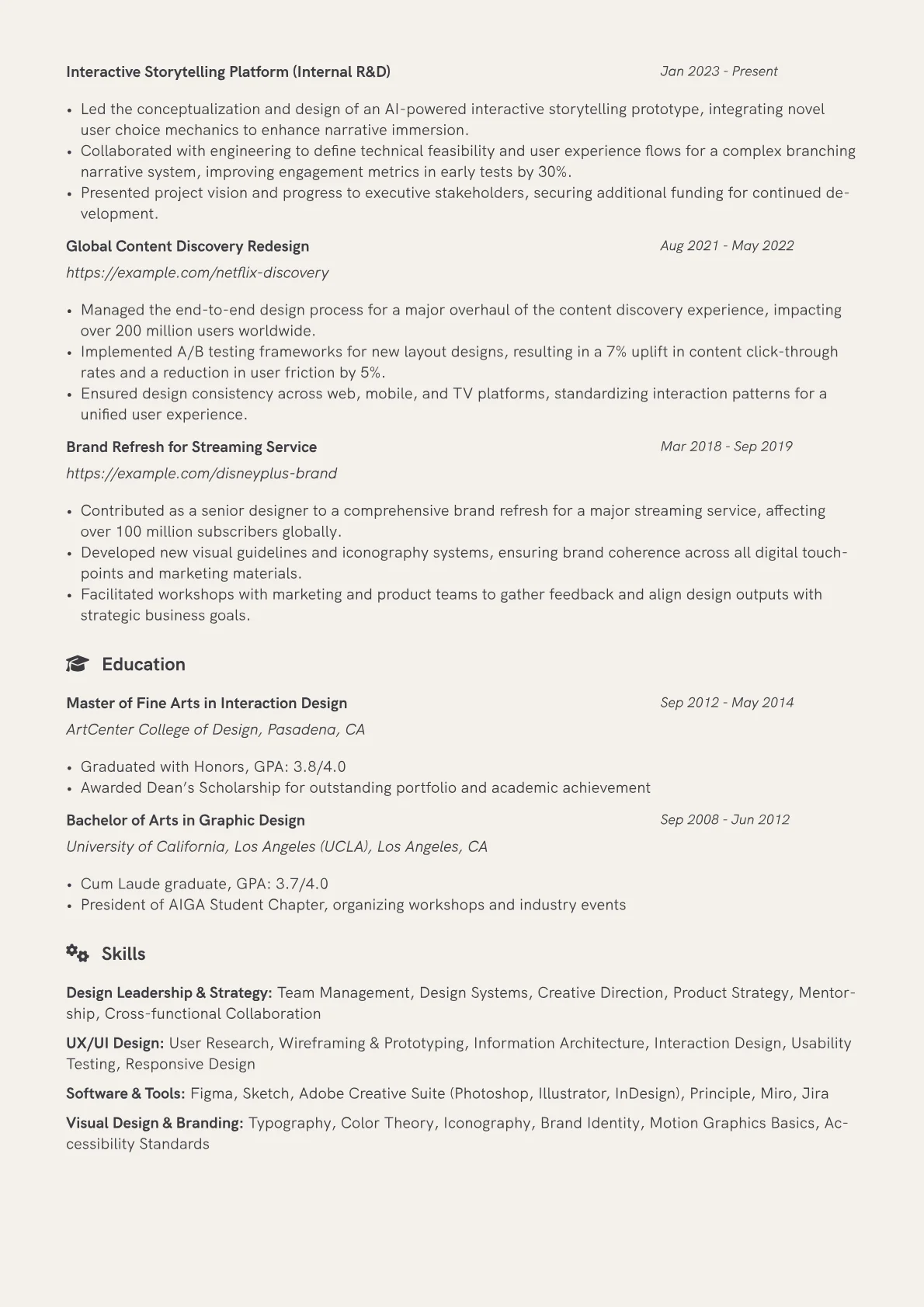 This example CV excels by clearly articulating these strategic contributions. Achievements are effectively quantified, illustrating how design initiatives directly impacted key business metrics, rather than just listing responsibilities. Skills are thoughtfully grouped into categories like "Strategic Design Leadership," "UX/UI Methodologies," and "Technical Proficiency," providing a quick overview of capabilities. Crucially, specific tools and relevant certifications, such as those related to design thinking or agile project management within creative pipelines, are prominently highlighted, reassuring hiring teams of the candidate's practical expertise.
