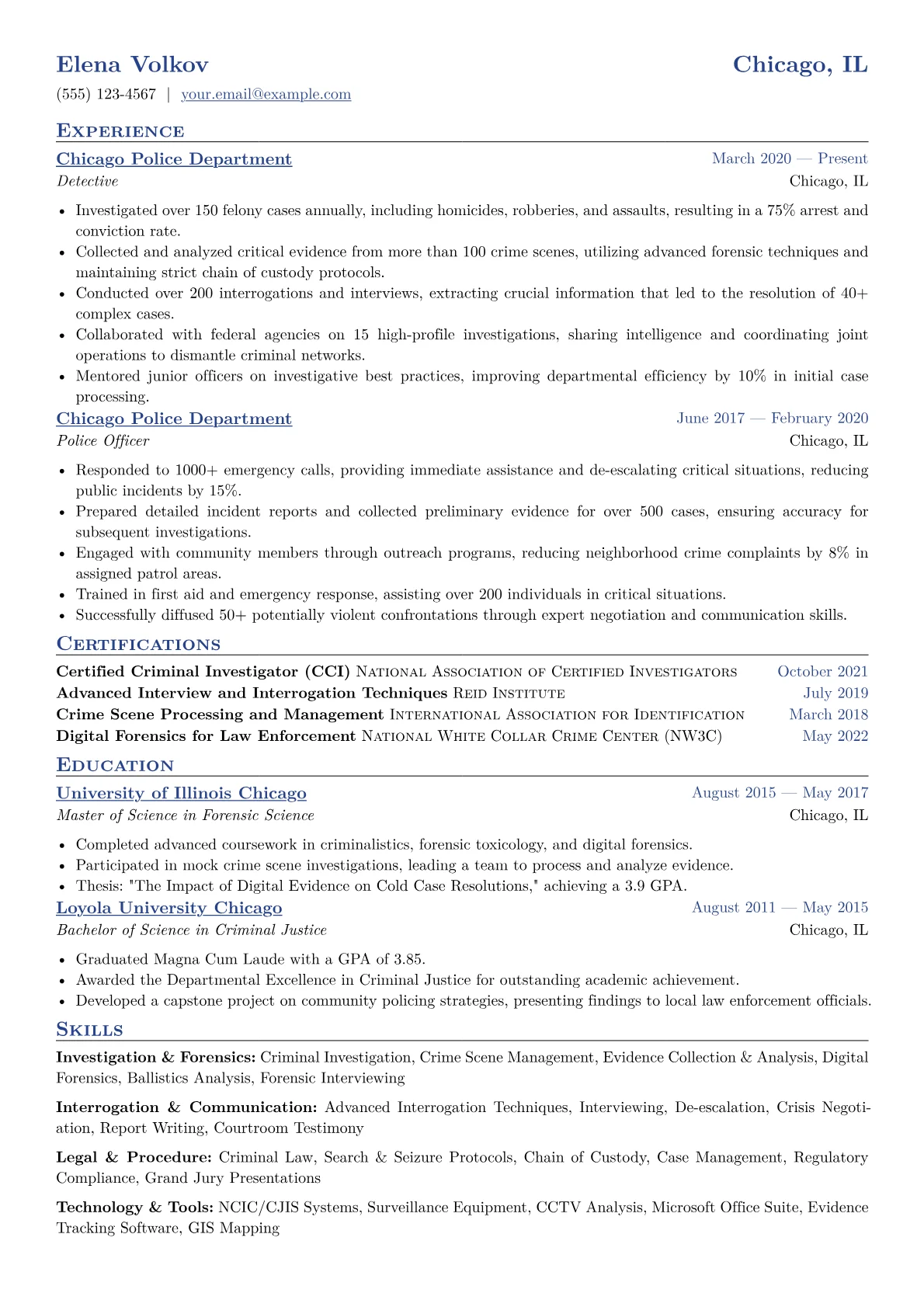 A strong Detective resume in the government sector must emphasize rigorous investigative methodologies, adherence to legal frameworks, and a commitment to public service. Government hiring managers seek candidates with proven abilities in evidence collection, detailed report writing, and effective interviewing, often under significant public scrutiny. The unique challenge lies in showcasing adaptability to diverse case types while maintaining strict procedural compliance.