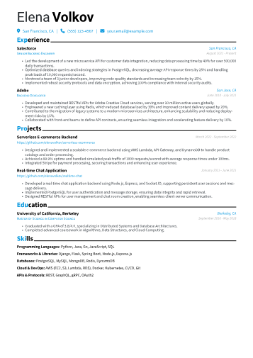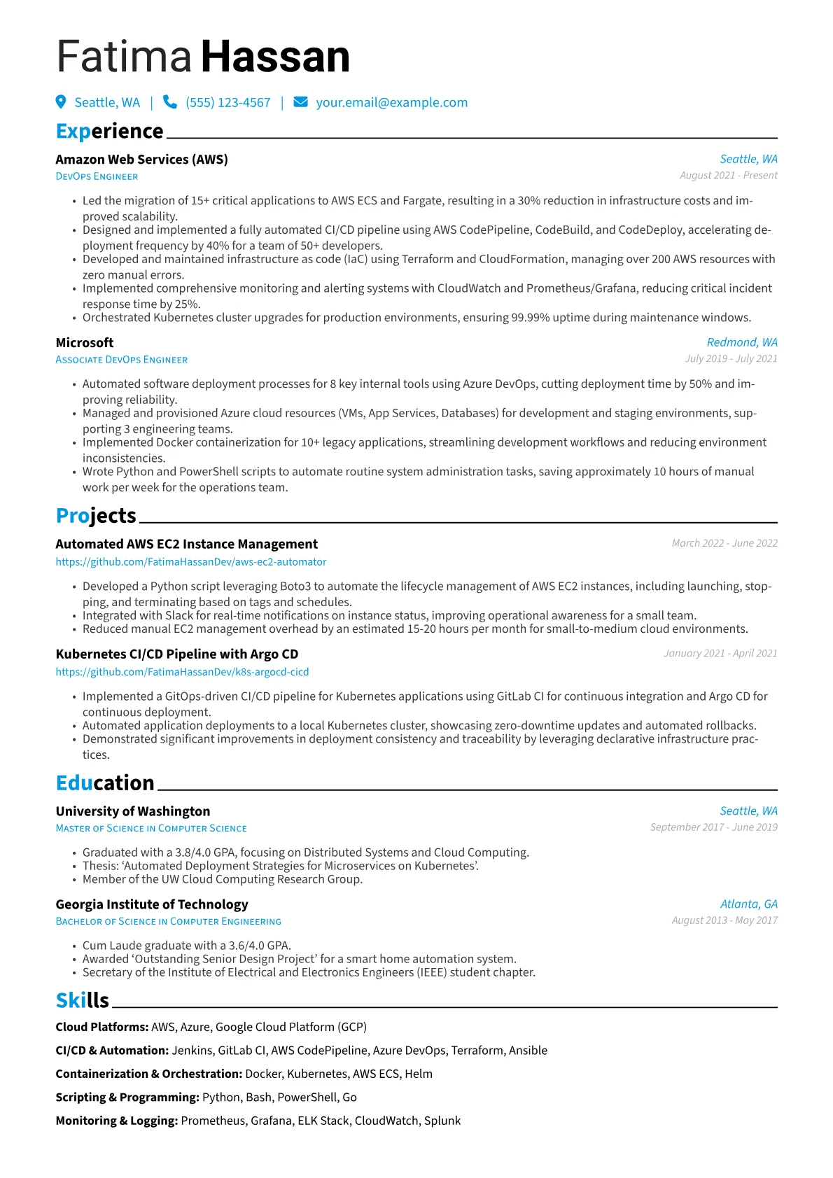 This JobSprout example particularly excels by prominently featuring quantified achievements, such as specific reductions in deployment times or improvements in system stability. Its well-structured skills section groups relevant technologies like cloud platforms (AWS/Azure), CI/CD tools (Jenkins, GitLab), and scripting languages (Python, Bash), making it easy for recruiters to identify core competencies. Furthermore, relevant certifications are clearly highlighted, validating expertise.
