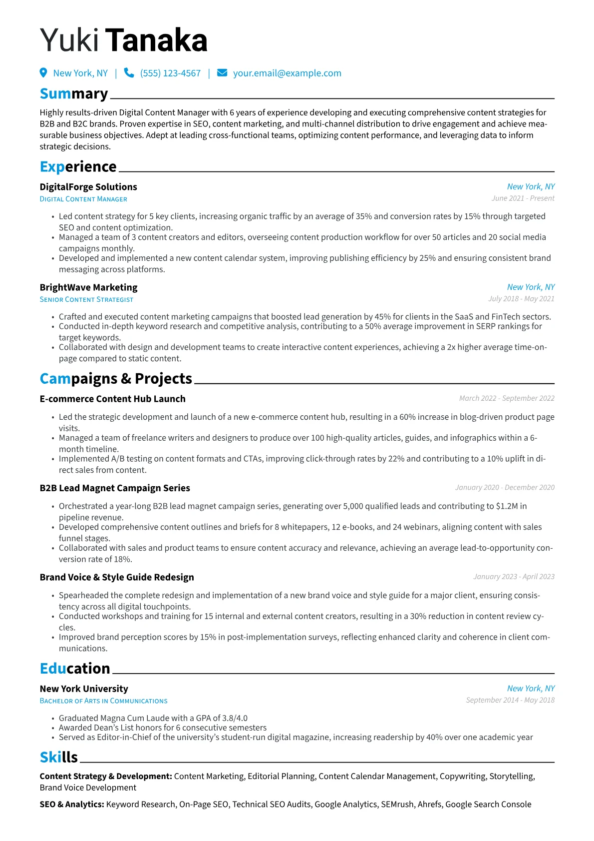 This template was built with JobSprout and can be remixed to create your own tailored Digital Content Manager resume.
