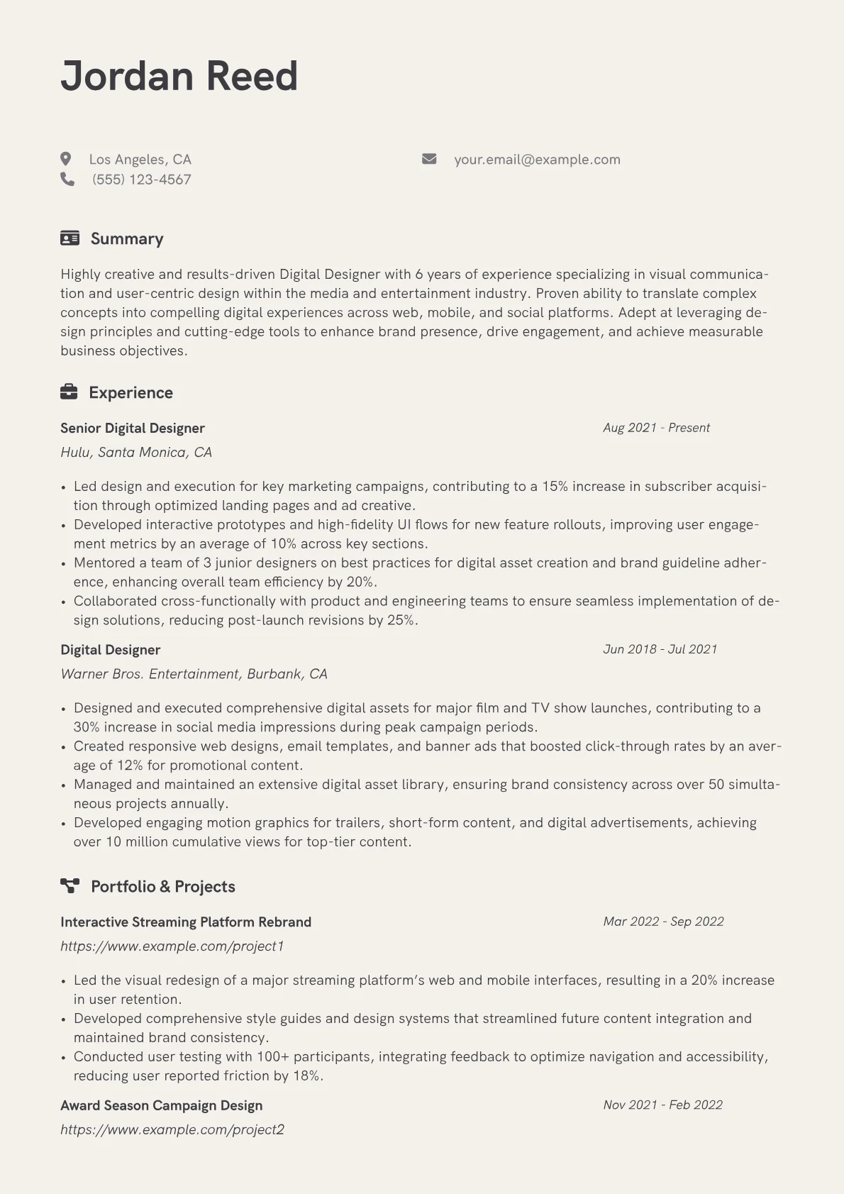 This template was built with JobSprout and can be remixed to create your own tailored Digital Designer resume, ready to impress within the Media & Entertainment industry.