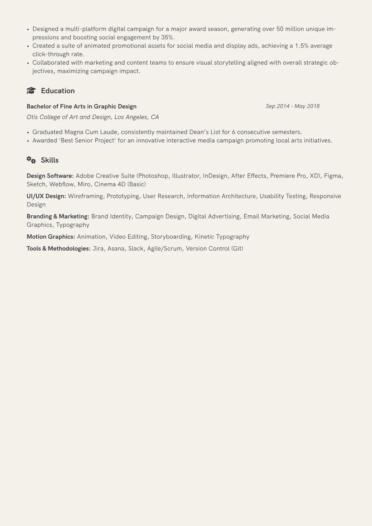 The featured Digital Designer resume example effectively showcases these critical elements. It quantifies achievements by detailing project contributions, such as "reduced user onboarding friction by 18% through iterative wireframing and prototyping." Skills are thoughtfully grouped into categories like "Design Software" (Figma, Adobe XD, Cinema 4D) and "UX Methodologies" (User Research, Information Architecture, A/B Testing), making it easy for recruiters to identify relevant expertise. Important certifications, alongside a clear portfolio link, are prominently displayed, reinforcing the candidate's specialized background.