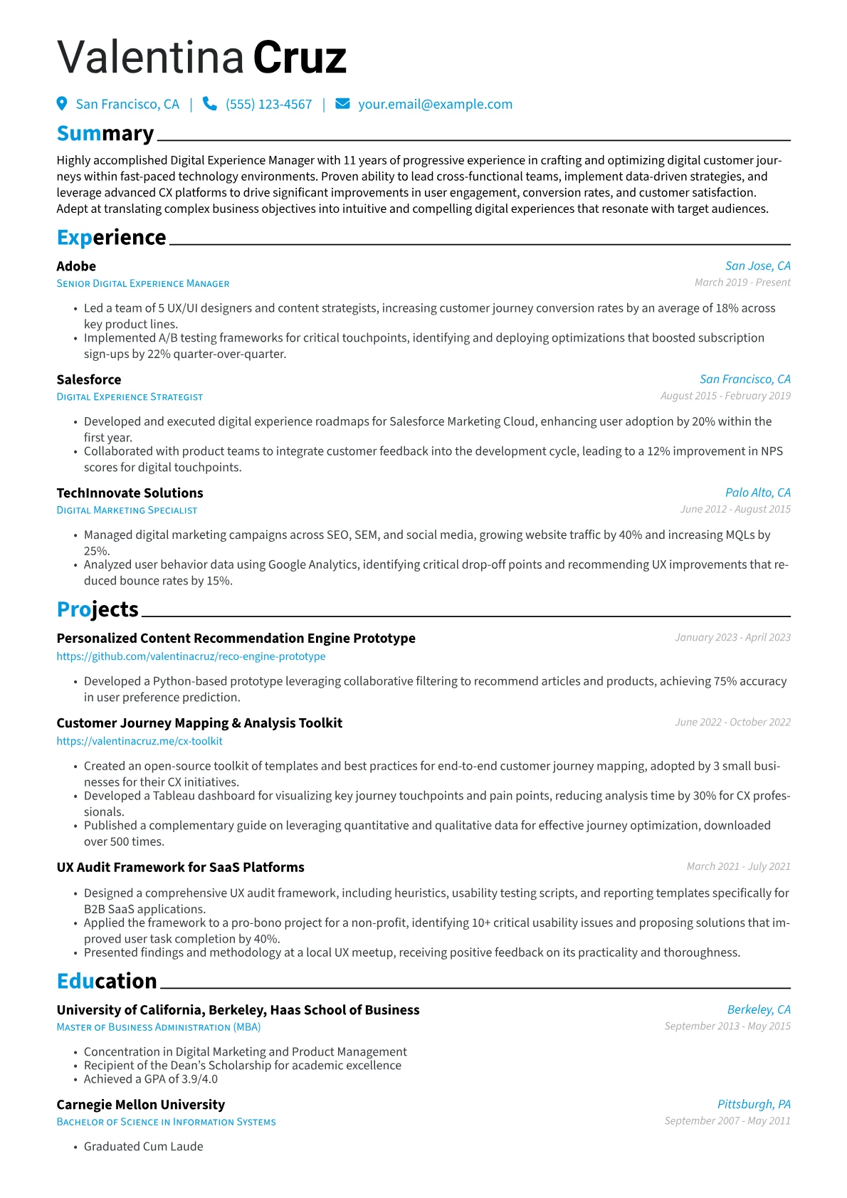 This template was built with JobSprout and can be remixed to create your own tailored Digital Experience Manager resume.
