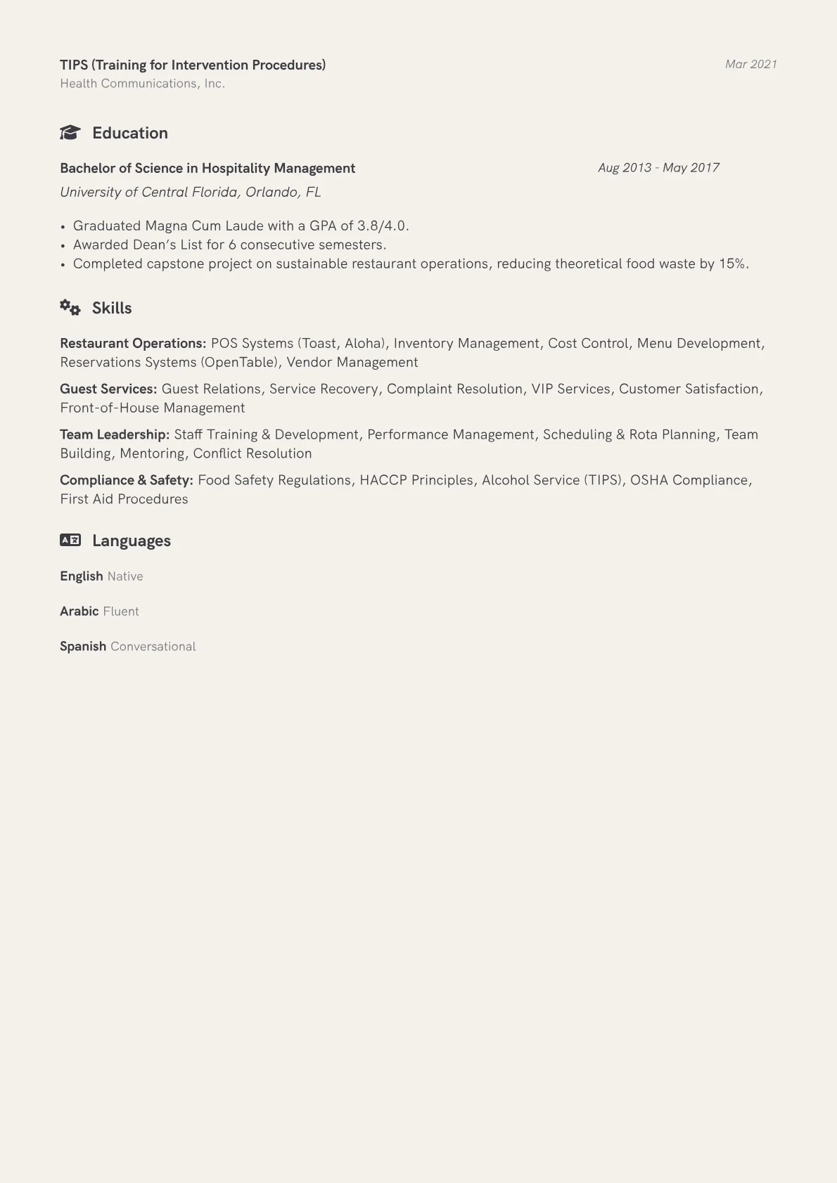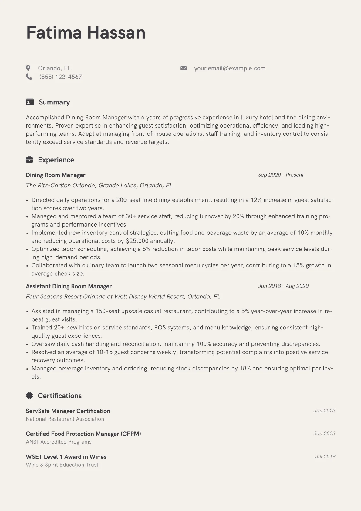 This example resume effectively showcases these critical elements. Its achievements section quantifies impact, detailing improvements like a 10% reduction in food waste and successful oversight of events accommodating 150+ guests. Skills are intelligently grouped under headings such as "Operational Leadership," "Guest Relations Management," and "Team Development," clearly communicating diverse capabilities. The resume also prominently features relevant certifications like ServSafe, alongside proficiency in industry-specific tools such as OpenTable and Toast POS, demonstrating a comprehensive command of modern dining operations.