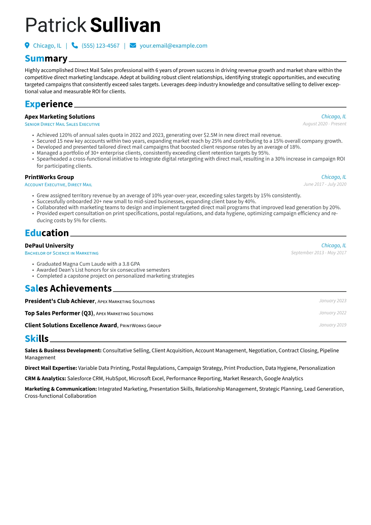 The JobSprout example excels by clearly quantifying improvements in response rates and lead conversion within its experience section. It features a dedicated skills section effectively segregating direct mail software proficiency, such as postal optimization tools and CRM platforms like Salesforce, from broader sales competencies. The template further highlights expertise in postal regulations and data analytics, showcasing a strategic approach to direct mail campaign optimization rather than merely execution. This structure enables recruiters to quickly grasp the candidate's impact.