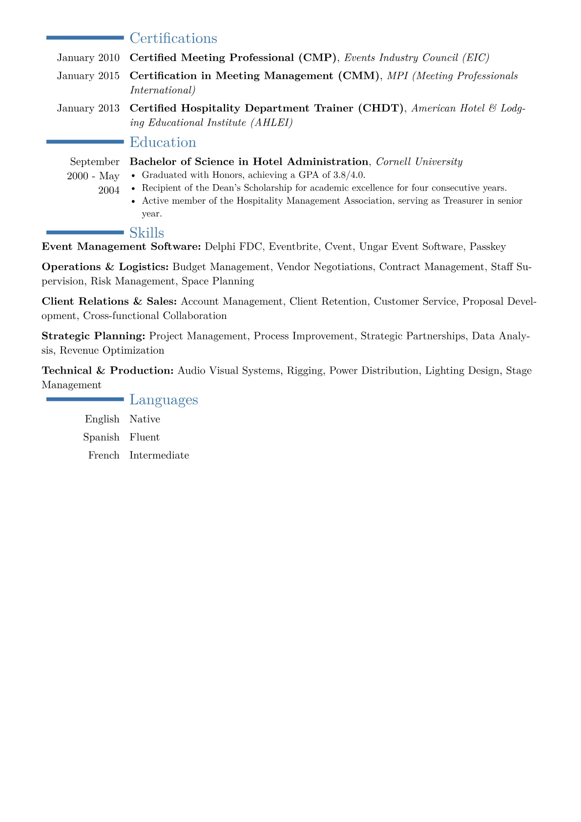 Hiring managers seeking a Director of Convention Services in a specialized "other" industry value demonstrated leadership in orchestrating complex, often high-stakes events. A strong resume highlights concrete achievements such as optimizing logistical workflows for large-scale conferences, reducing operational costs by specific percentages, or increasing delegate satisfaction scores. Candidates should emphasize proficiency in vendor contract negotiation, P&L management for multi-million dollar events, and crisis intervention. Key terminology like comprehensive risk assessment, advanced event technology integration, and sustainable event practices resonates deeply. Certifications such as CMP (Certified Meeting Professional) or CMM (Certification in Meeting Management) signal a commitment to industry best practices, showcasing expertise beyond standard hospitality roles.