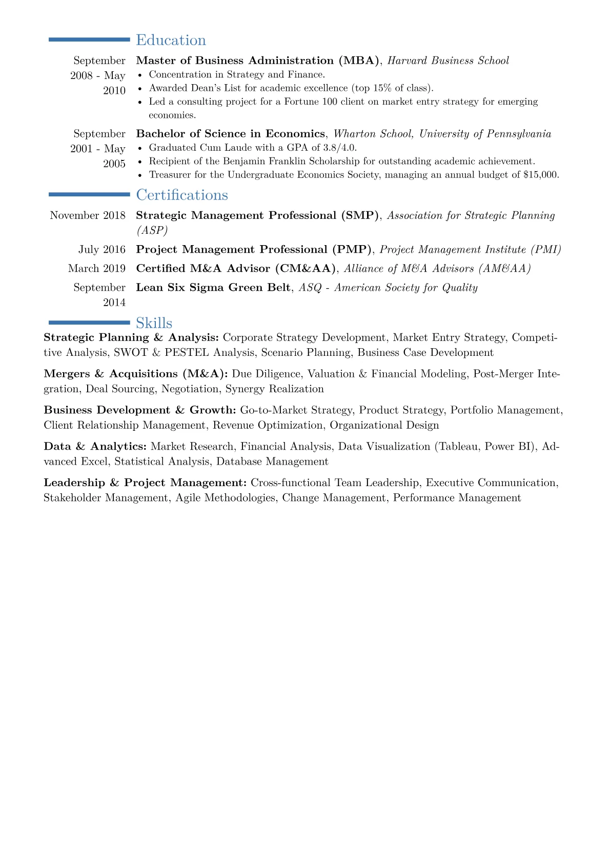 This example CV excels by meticulously quantifying its impact, transforming responsibilities into measurable accomplishments. Instead of broad statements, it showcases specific achievements such as "Increased client revenue by 20% through new market entry strategy" or "Reduced operational expenditure by $5M across three divisions." Skills are thoughtfully grouped, separating high-level strategic competencies like "Business Model Innovation" and "Competitive Intelligence" from operational expertise in "Process Re-engineering" and "Supply Chain Optimization." The resume effectively highlights industry-specific tools and certifications, immediately communicating a command of relevant methodologies crucial for an executive strategy role in consulting.