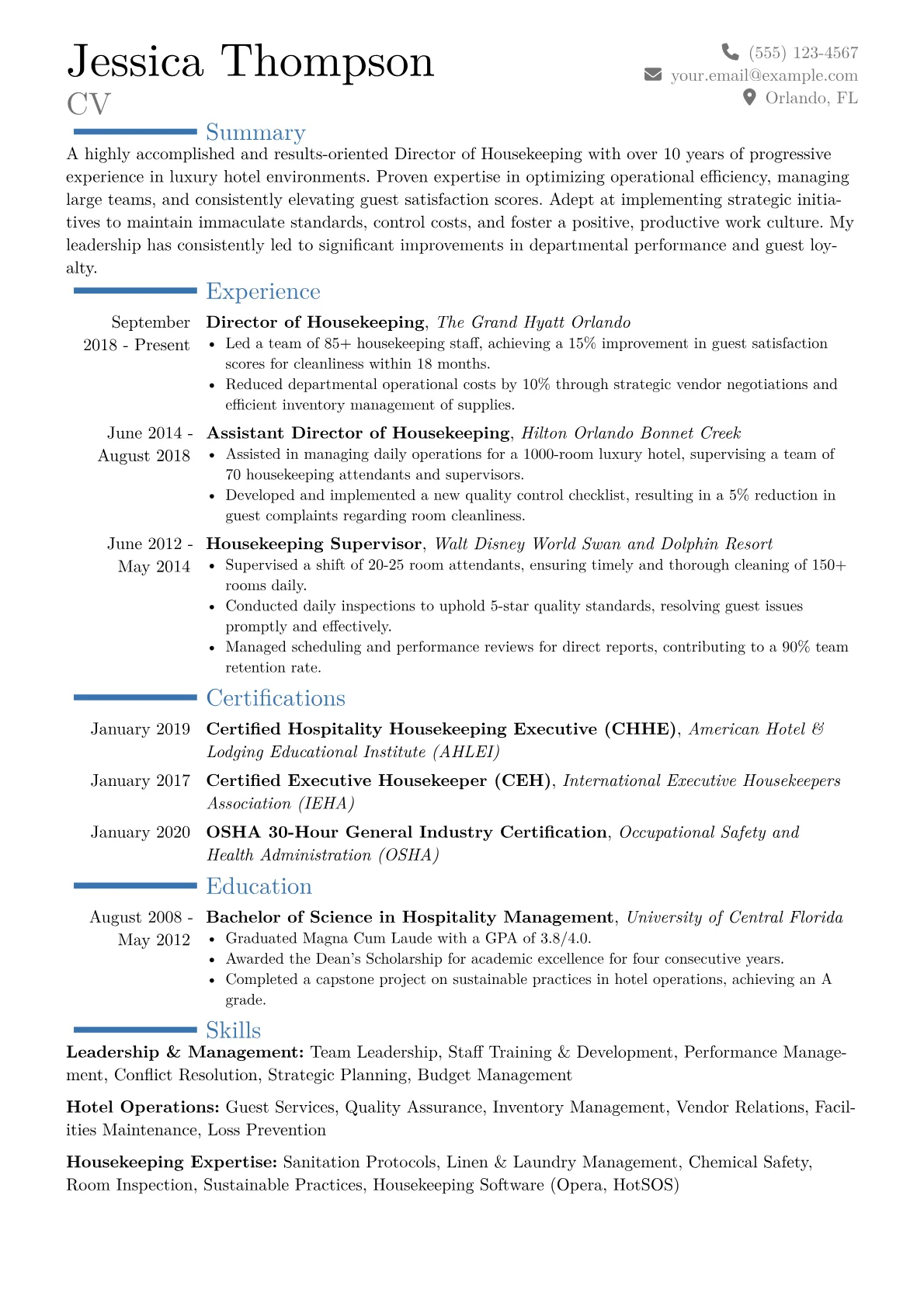 This template was built with JobSprout and can be remixed to create your own tailored Director of Housekeeping resume. It provides an excellent framework for presenting your senior-level expertise.
