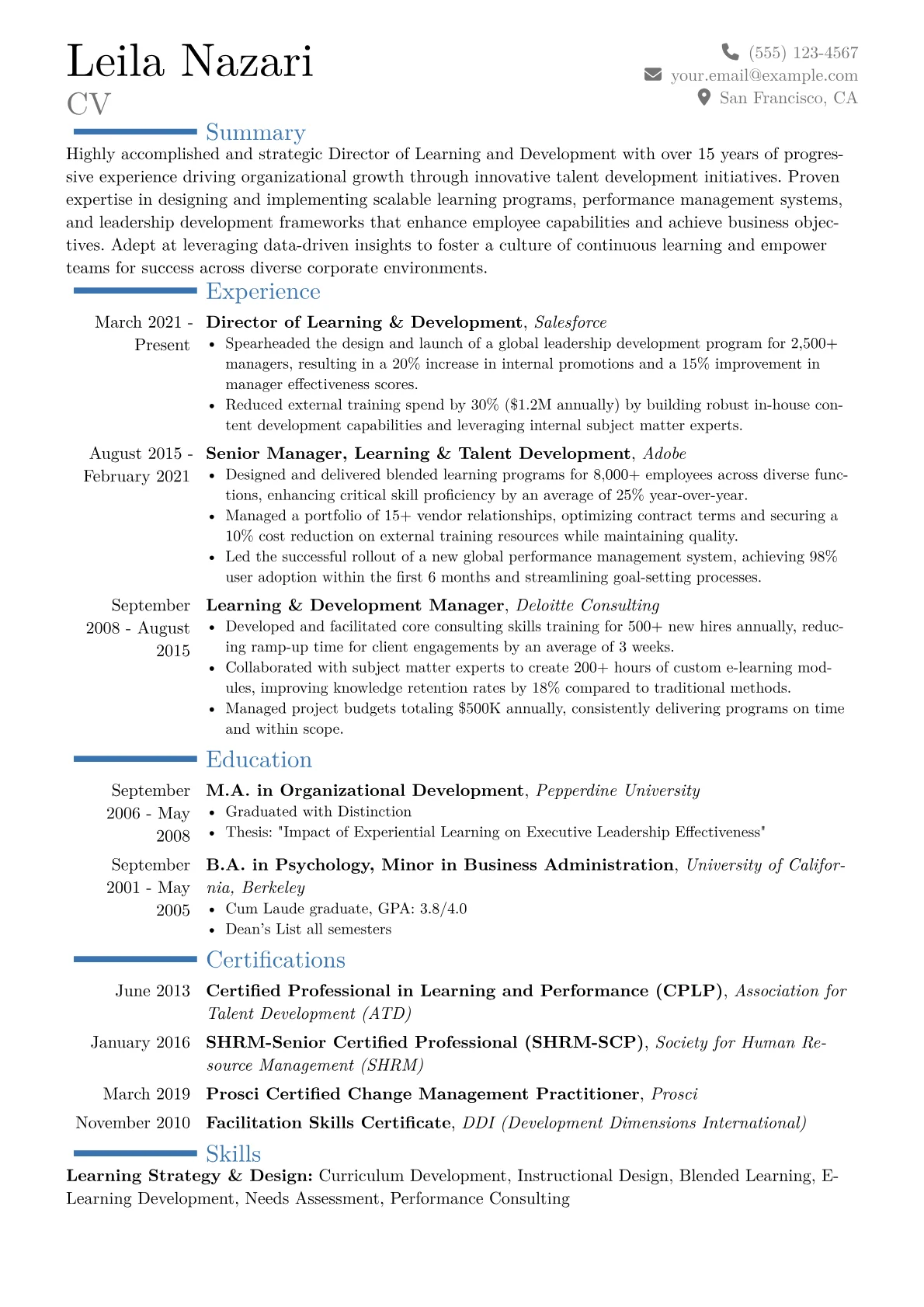 This example CV effectively highlights these critical elements. Its structured achievement bullet points quantify success, illustrating improvements like "reduced time-to-proficiency by 20% for new hires" or "increased internal promotion rates by 15%." Skills are thoughtfully grouped into strategic categories such as "Organizational Development," "Talent Management," and "Learning Technologies," clearly demonstrating breadth and depth. The resume also prominently features relevant certifications and specific L&D tools, like LMS platforms and authoring software, underscoring practical expertise alongside strategic vision.