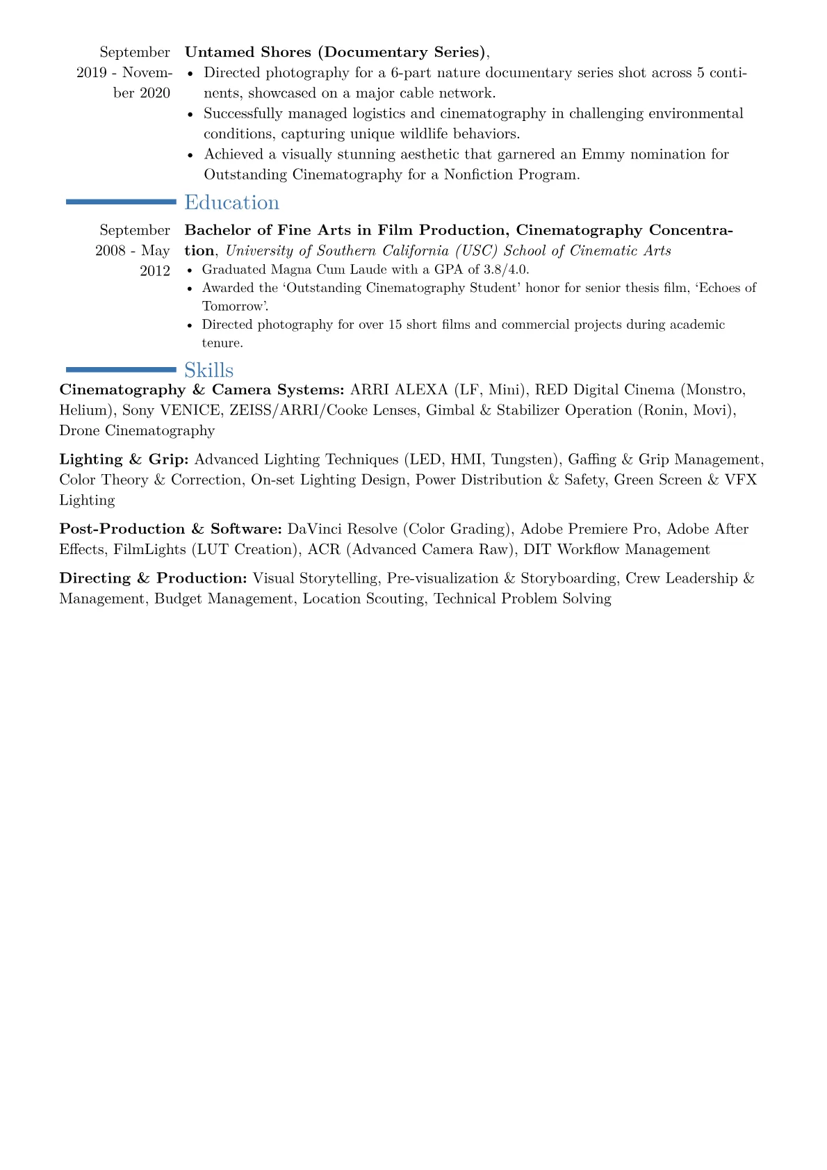 This example CV effectively highlights these critical aspects. Achievements are quantified, detailing contributions such as "reduced shoot days by 10% through efficient lighting setups" or "managed a camera department budget of $X across multiple projects." Technical proficiencies are clearly grouped, featuring specific camera bodies, lens packages, and lighting consoles like grandMA3. Furthermore, the resume strategically showcases a progression of responsibility, emphasizing leadership in camera and G&E teams. The inclusion of a dedicated portfolio link directly addresses the visual nature of the role, allowing hiring managers to immediately assess the candidate's creative output.