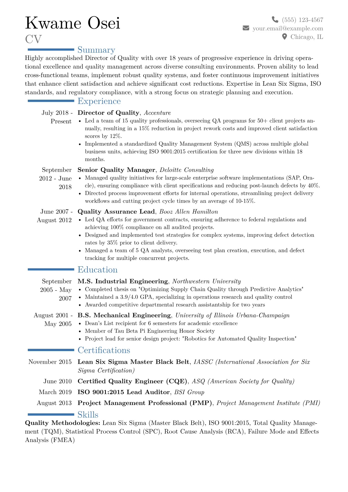 This example CV excels by clearly quantifying its impact on client projects, directly addressing the consulting industry's focus on demonstrable value. Skills are thoughtfully grouped, separating technical proficiencies like QMS platform expertise from leadership capabilities in driving quality culture. Furthermore, the resume effectively highlights pertinent certifications and specialized tools in a dedicated section, ensuring a hiring manager quickly identifies the candidate's strategic capabilities in quality assurance and process improvement for multi-client portfolios.
