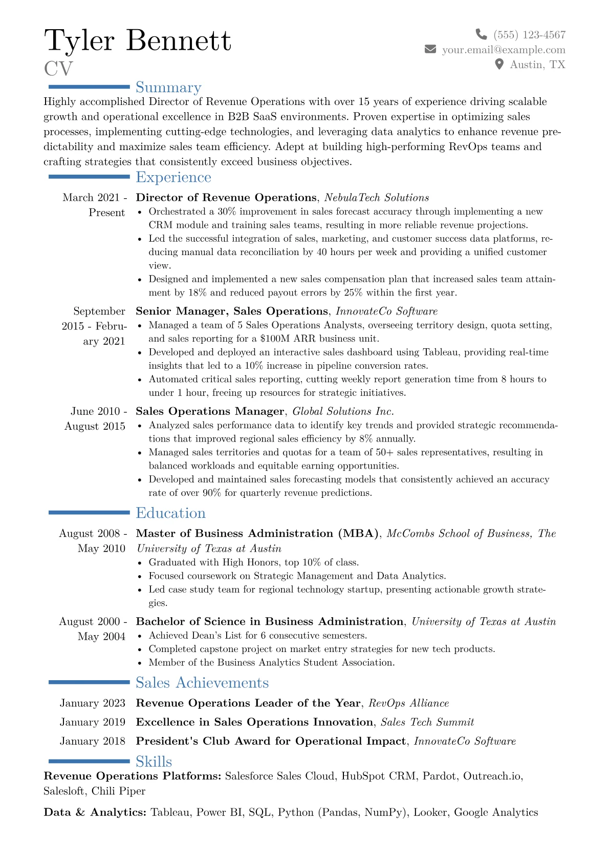 This example CV excels at presenting such high-level impact through its thoughtful structure. Achievements are consistently quantified using metrics like percentage increases in sales productivity, reductions in operational costs, or improvements in data integrity, effectively showcasing ROI. Skills are intelligently grouped, separating strategic leadership competencies such as change management and GTM planning from technical proficiencies like specific CRM administration or BI tool mastery. Furthermore, the resume dedicates clear sections to highlight relevant certifications and a comprehensive technology stack, underscoring both foundational knowledge and a commitment to continuous learning within a rapidly evolving field.