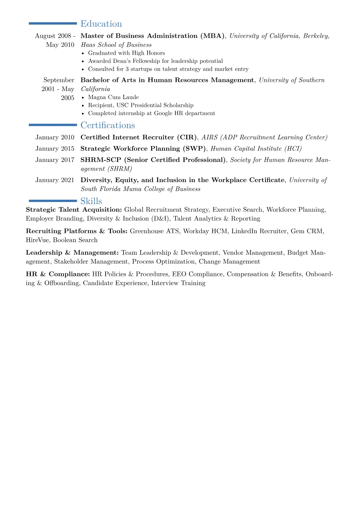 The example resume effectively showcases these elements. Achievements are quantified, illustrating a 20% reduction in average time-to-hire and a 15% increase in offer acceptance rates for hard-to-fill positions. Skills are logically grouped under categories like "Talent Strategy & Analytics" and "HRIS & ATS Management," specifically naming tools such as Greenhouse and LinkedIn Recruiter. This structure clearly highlights the candidate's executive-level competencies and technological fluency in a talent acquisition leadership capacity.