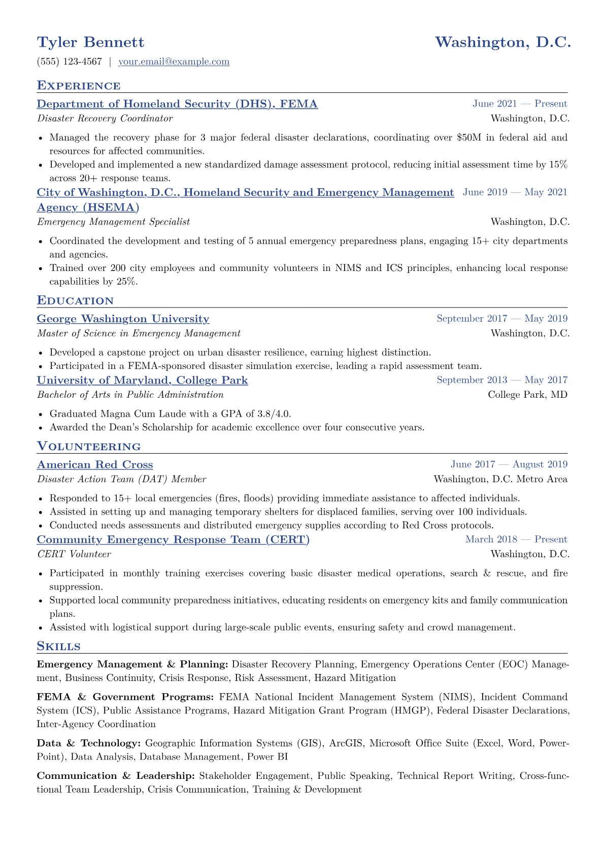 This example excels by showcasing quantified achievements that clearly demonstrate impact, such as specific recovery time reductions or successful incident management outcomes. It effectively groups relevant technical and soft skills, along with critical certifications like CEM or PMP, which are highly valued in public sector emergency management. This structure allows hiring managers to quickly identify essential qualifications and a proven track record.