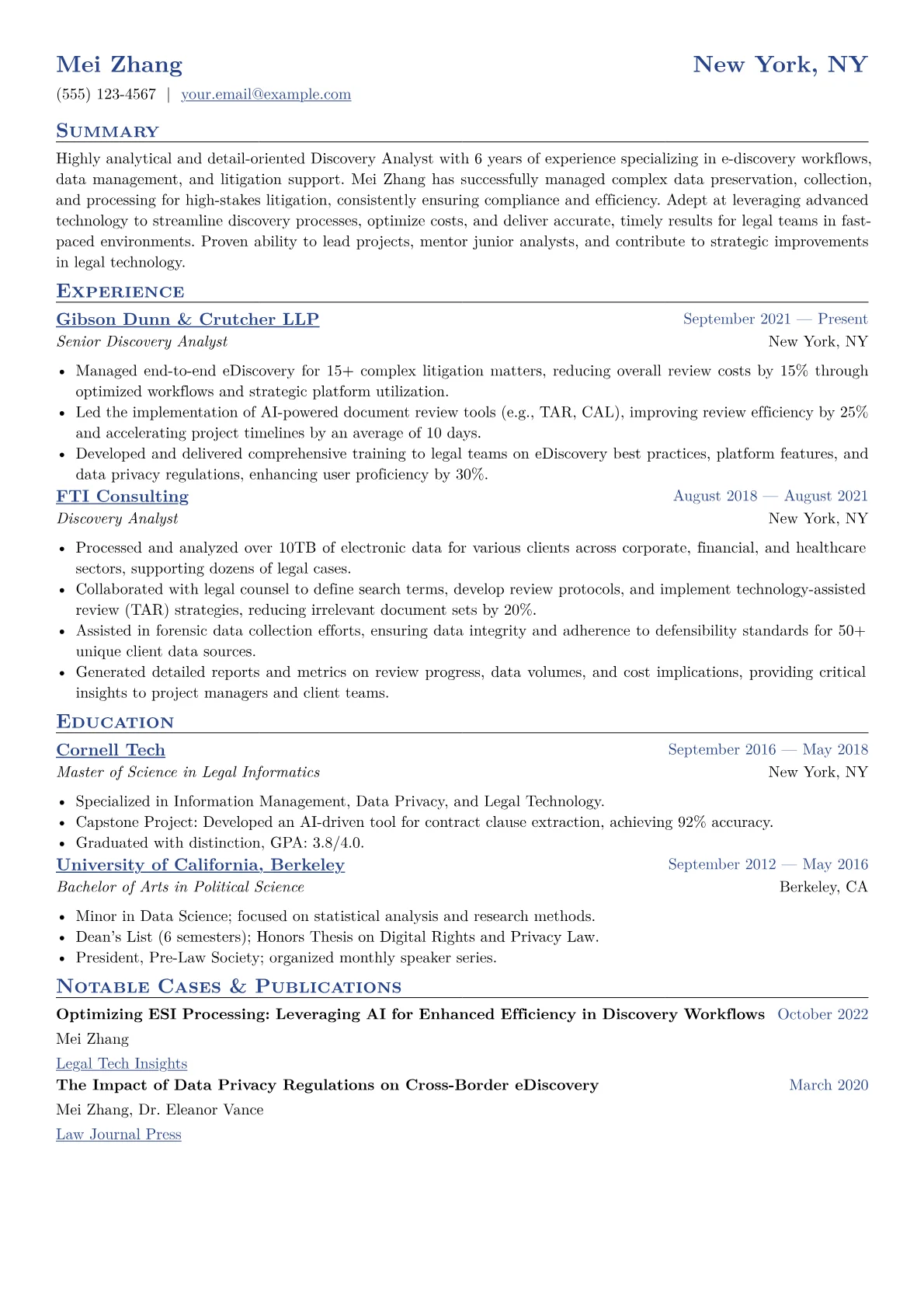 Hiring managers for mid-level Discovery Analyst roles in Legal prioritize demonstrated expertise in ESI processing, data governance, and defensible e-discovery workflows. They seek practical experience managing large datasets within litigation contexts, understanding nuances like privilege review protocols and subpoena responses. Concrete achievements often involve optimizing review processes, coordinating with legal teams on search term implementation, and ensuring compliance with data preservation requirements. Familiarity with specific e-discovery platforms such as Relativity, DISCO, or Everlaw is essential, as is a foundational understanding of TAR protocols and ACEDS certification. The ability to articulate the impact of discovery efforts on case strategy and risk mitigation is highly valued.
