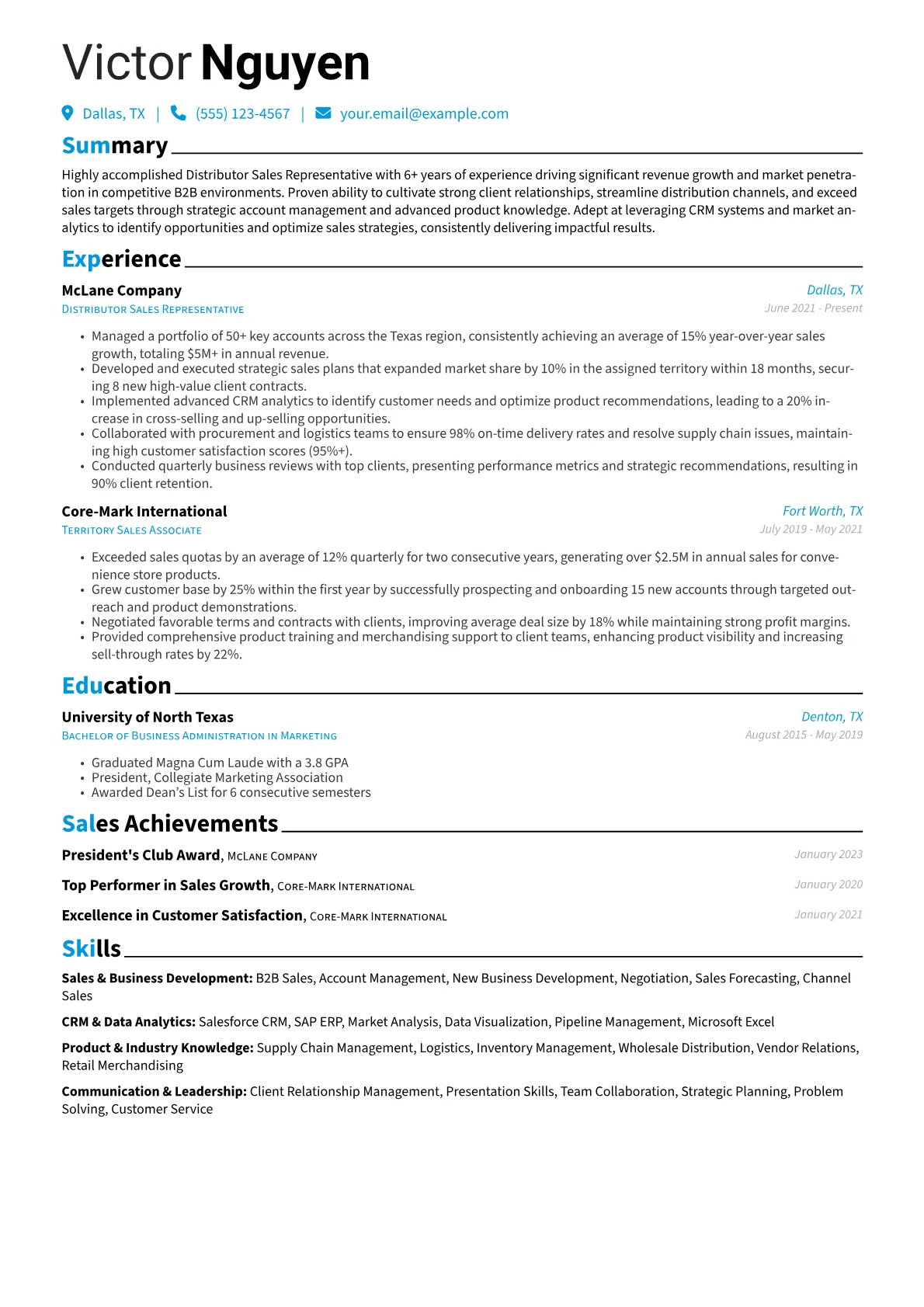 This template, built with JobSprout, offers a strong foundation that can be remixed to create a tailored Distributor Sales Representative resume reflecting your unique experience.