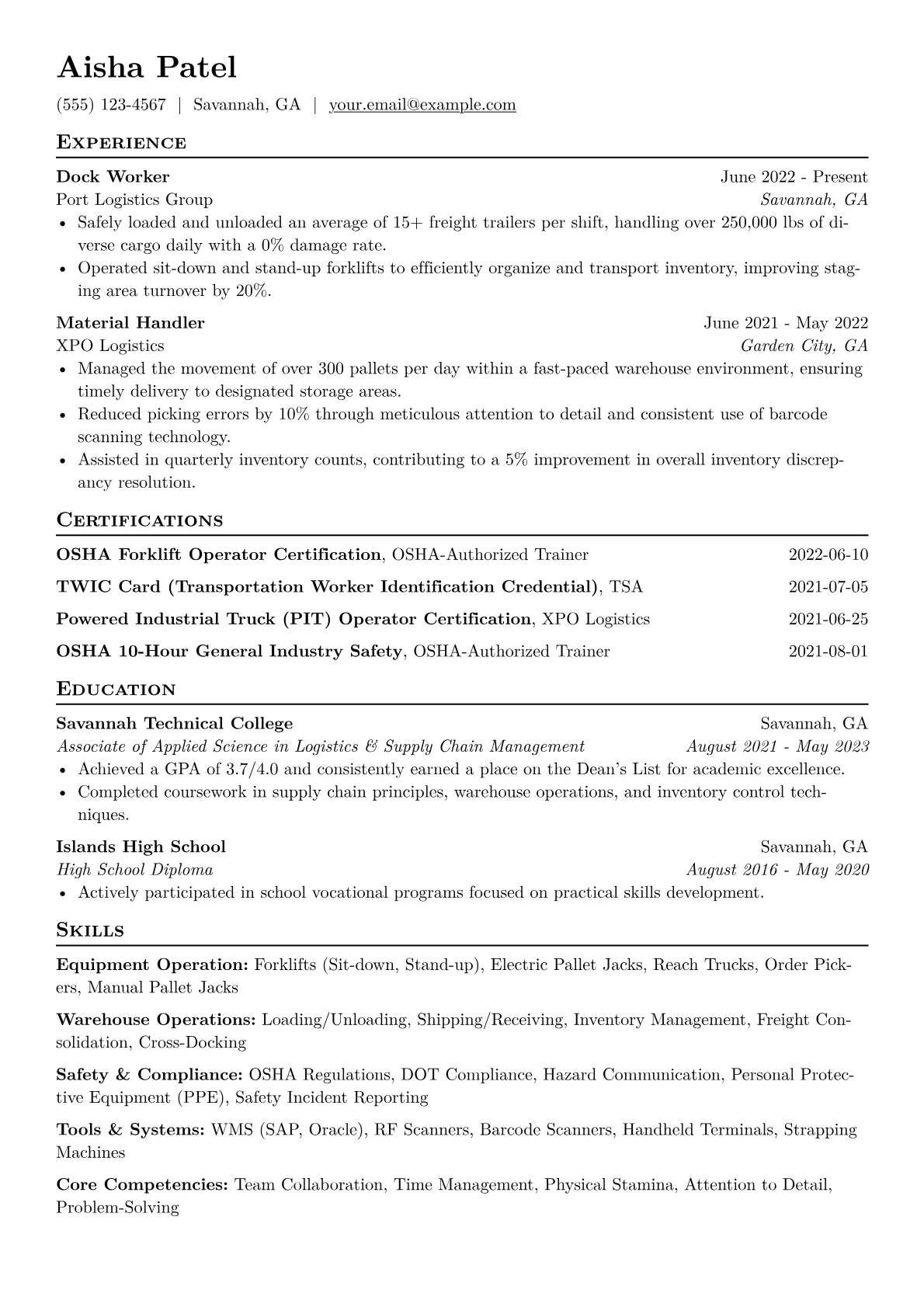 This example resume excels by prominently featuring quantified achievements, such as specific volumes of goods handled or improvements in processing times, which clearly illustrate impact. It also wisely groups relevant certifications, like forklift operation or OSHA training, highlighting critical qualifications at a glance. Additionally, the clear separation of technical skills from essential soft skills like teamwork and communication provides a comprehensive overview of the candidate’s abilities.