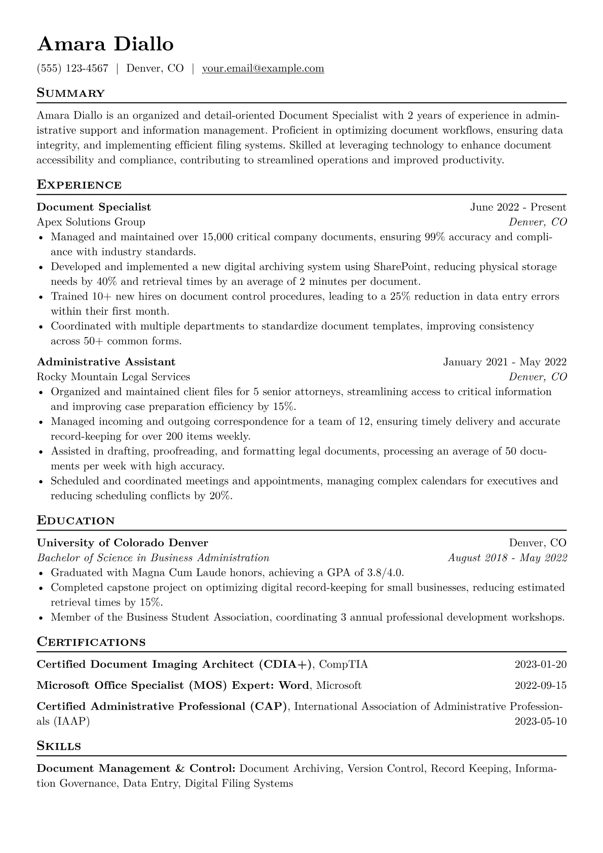 This template was built with JobSprout and can be remixed to create your own tailored Document Specialist resume. Utilize its structure to highlight your specific skills and contributions.